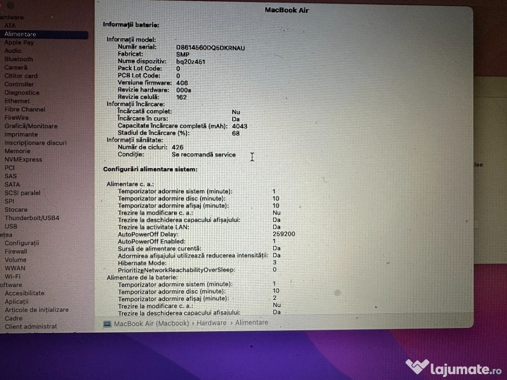 Bateria este originala si are doar 426 cicluri dar prezinta eroare Service Recommended.Este foarte posibil sa-si revina in timp.Merge fara incarcator si tine destul de mult.
