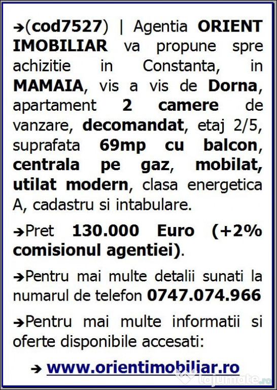 (cod7527) | Agentia ORIENT IMOBILIAR va propune spre achizitie in Constanta, in MAMAIA, vis a vis de Dorna, apartament 2 camere de vanzare, decomandat, etaj 2/5, suprafata 69mp cu balcon, centrala pe gaz, mobilat, utilat modern, clasa energetica A, cadastru si intabulare.Pret 130.000 Euro (+2% comisionul agentiei).