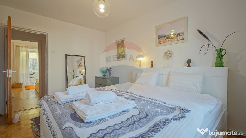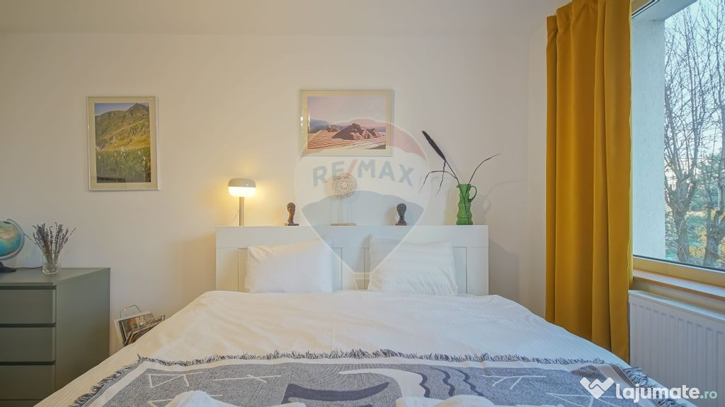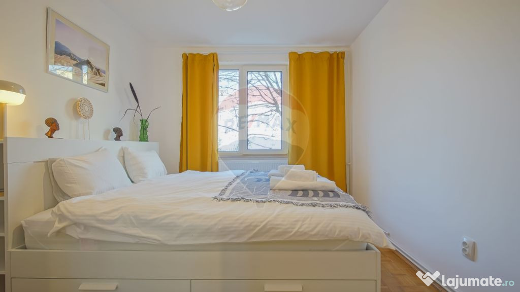Doua dormitoare spatioase, ambele mobilate complet, cu paturi matrimoniale, spatii de depozitare si ferestre mari care ofera multa lumina naturala.