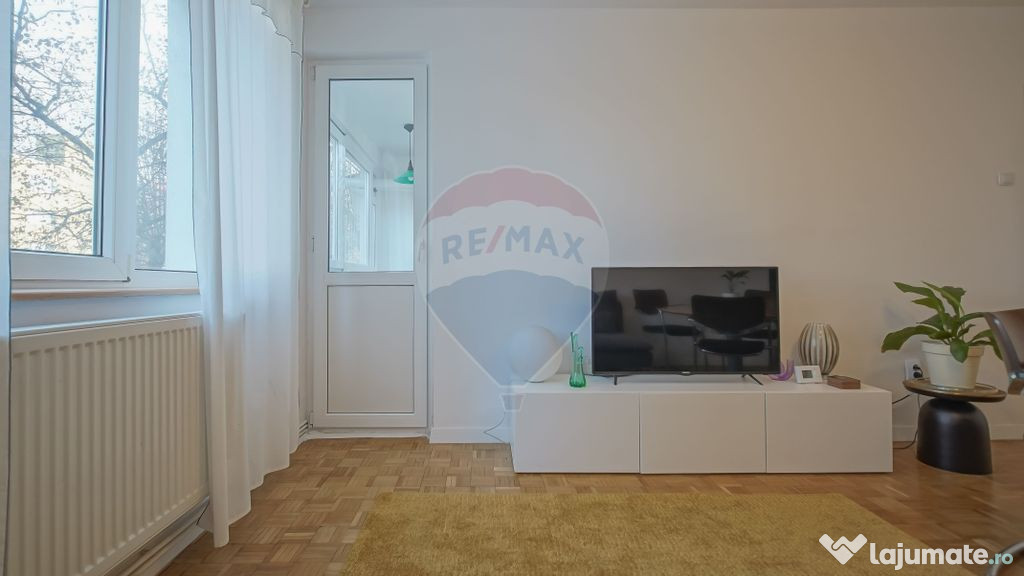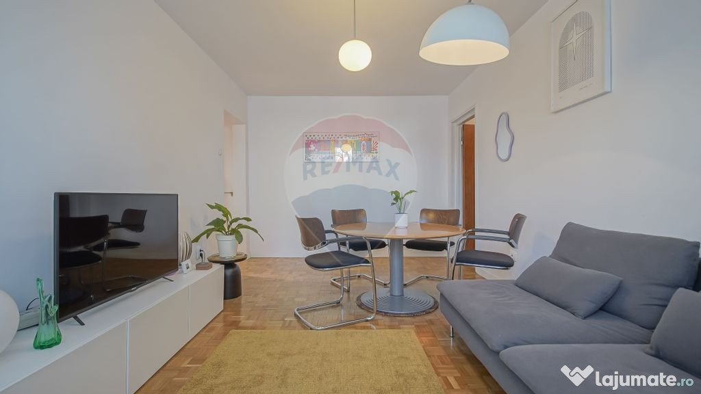 Living generos cu zona de dinning, canapea confortabila, TV si acces la un balcon inchis.