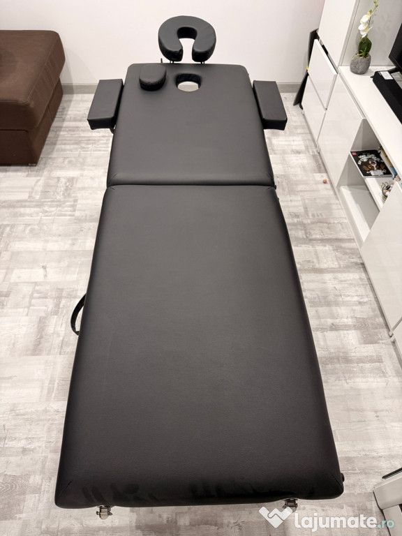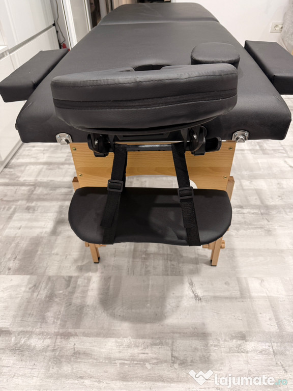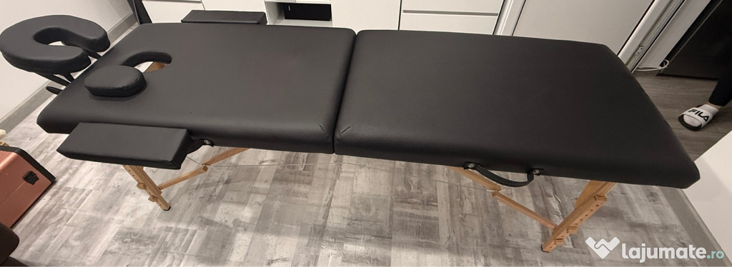 Masă masaj/ cosmetică portabilă și pliabilă. Structura este din lemn, cu cablu de oțel, piele ecologi ...
