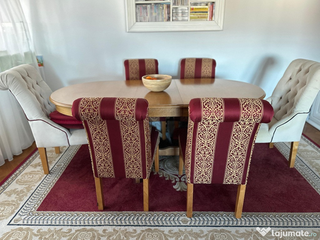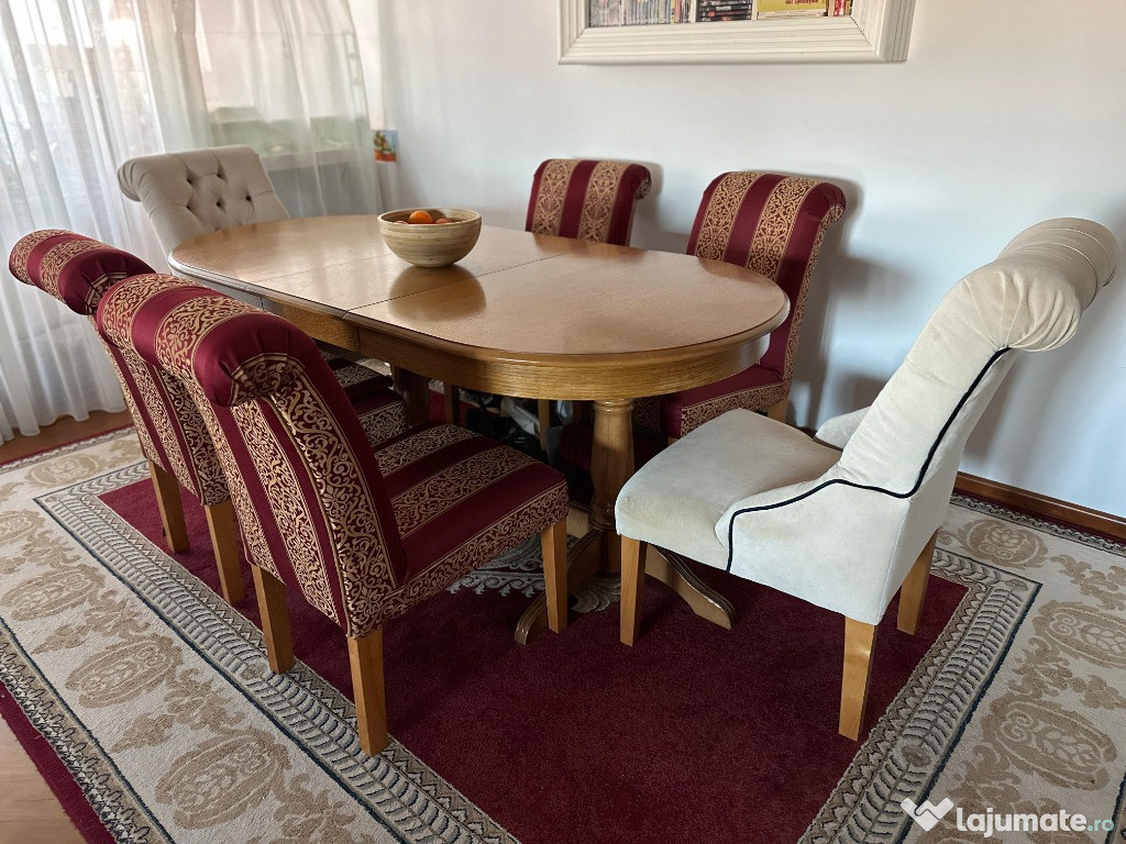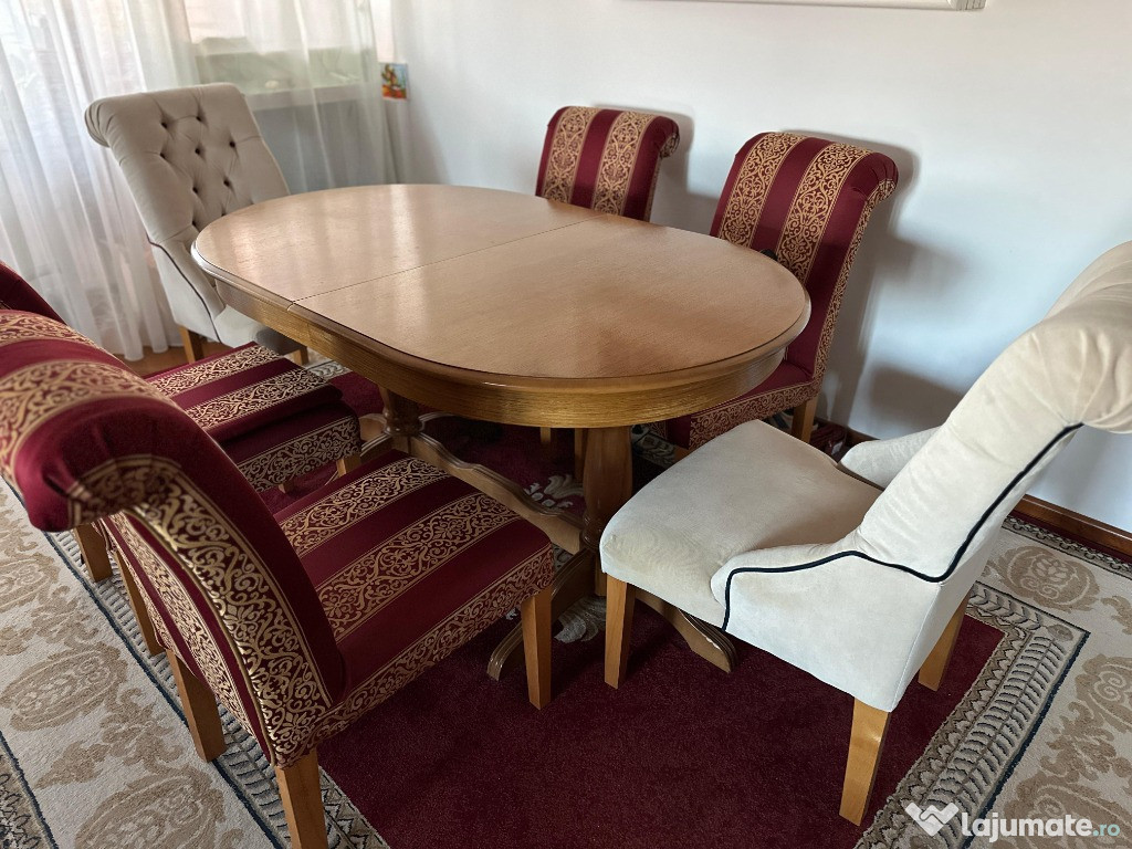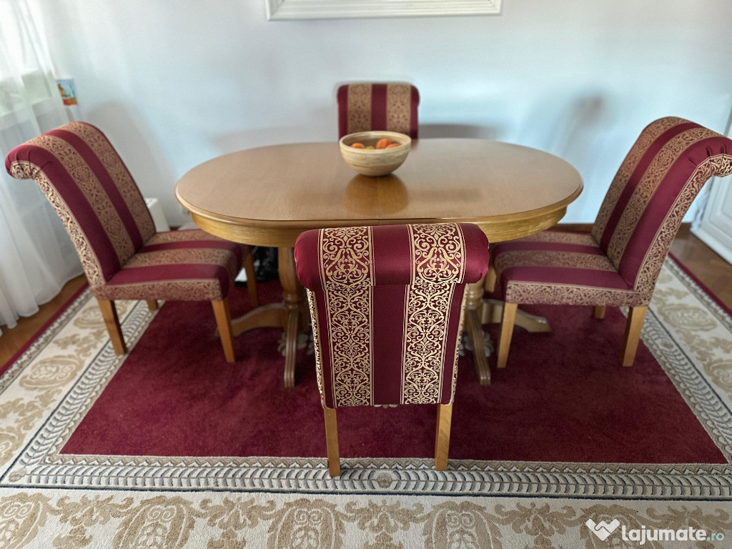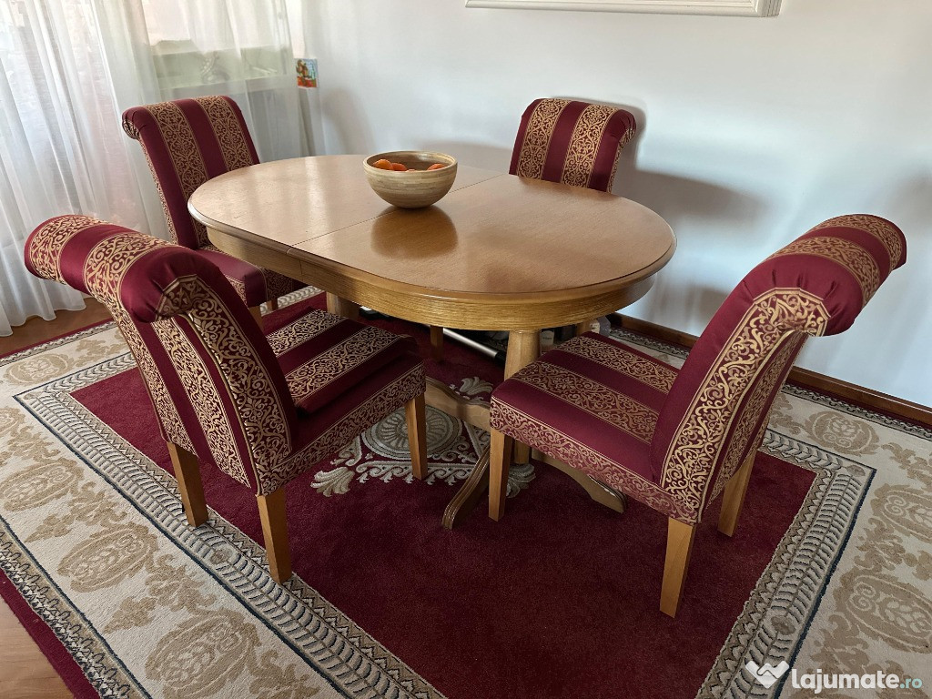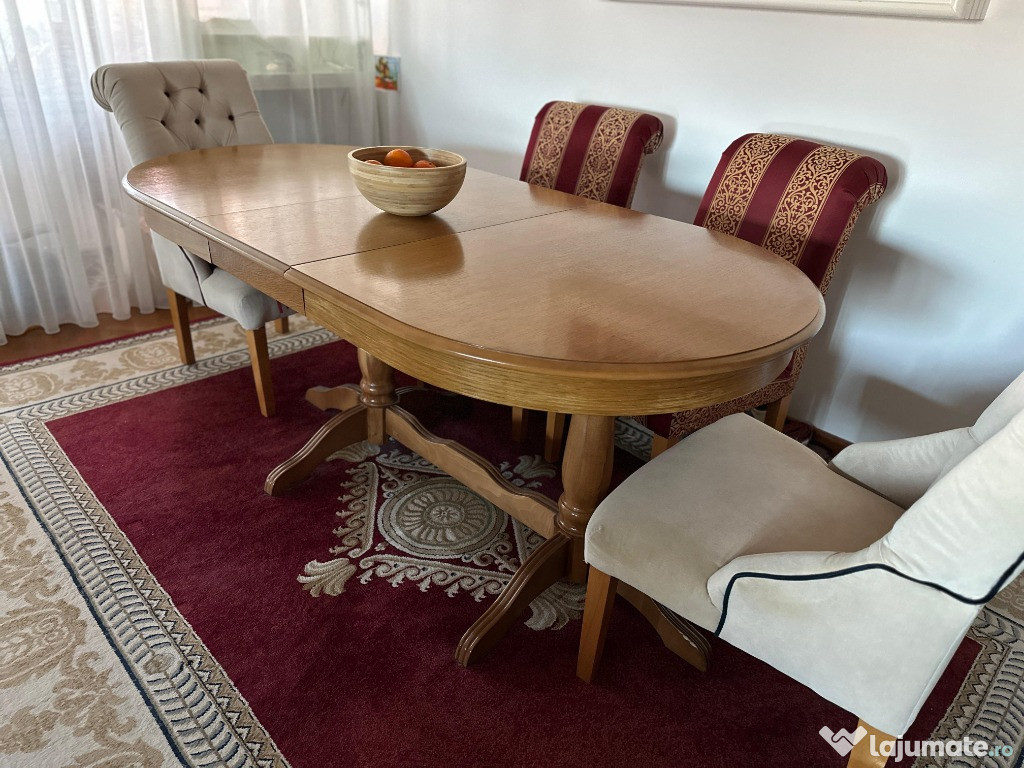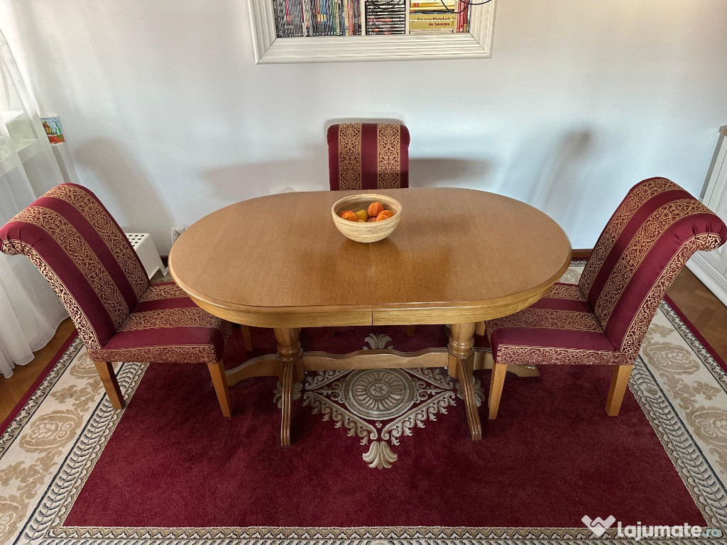 Vand masa din lemn masiv, extensibila in stare foarte buna. In varianta restransa are 160 cm, la care se pot adauga 3 extensii de cate 40 cm fiecare, ajungand astfel pana la 280cm. Latimea este de 100 cm.Masa se poate vinde si separat de scaune.
