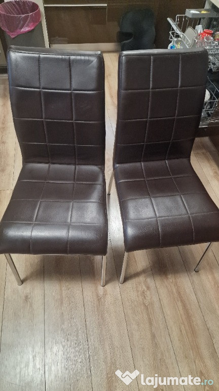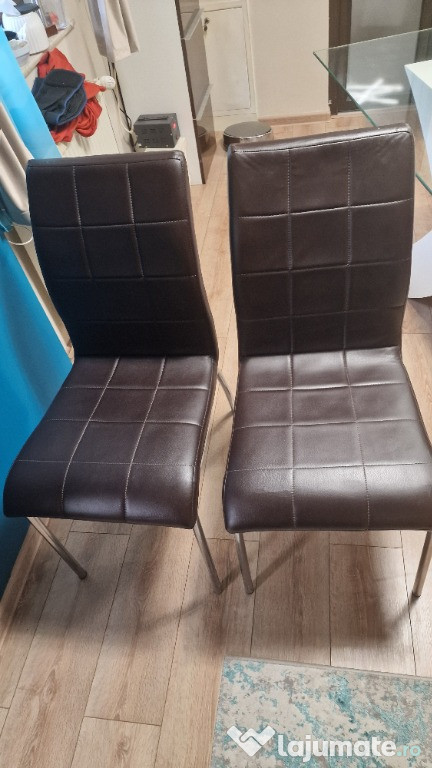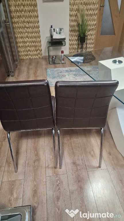 Patru scaune din piele maro, cu un design simplu și elegant. Sunt în stare bună de utilizare și pot fi o adăugare frumoasă la orice bucătărie sau living. Dimensiunile și confortul lor le fac potrivite pentru o masă de sticla cu următoarele dimensiuni- L-1300mm,l-800mm,h-770mmAnuntul Masă sticlă bucătărie este adaugat de pe LaJumate.ro.