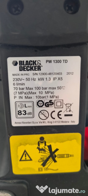 Masina de spalat cu presiune BLACK & DECKER PW1300TD, 1300W, 100bar, 360l/h Folosit de 5 ori. T ...