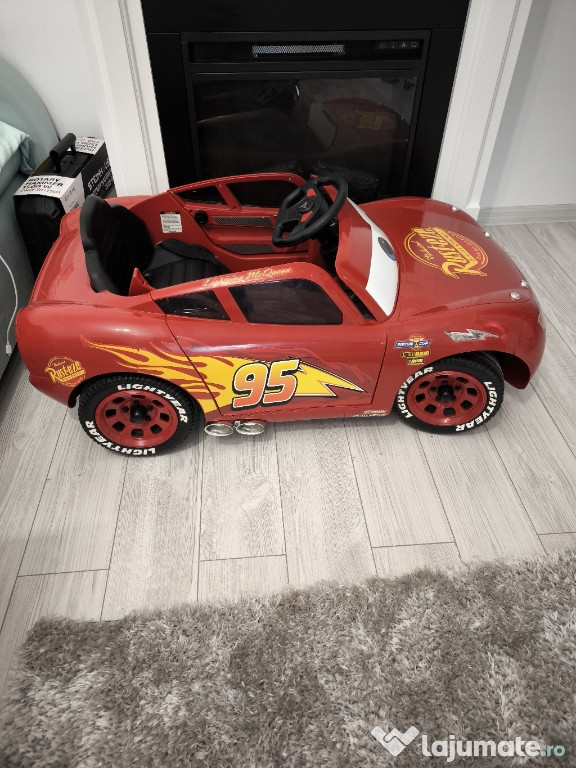 Este o mașină electrică de jucărie pentru copii, modelul Fulger McQueen din franciza Disney/Pixar Mașini.