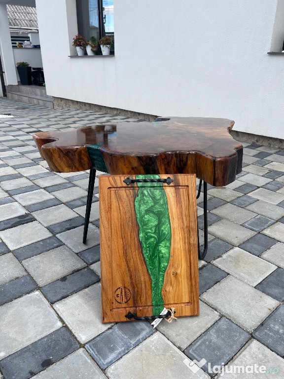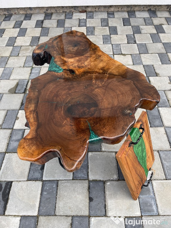 Vând măsuță de cafea realizată manual din rondea de nuc masiv, vechi de peste 100 de ani, cu rășină epoxidică verde aplicată pe ambele fețe.Blatul are o grosime de 10 cm, iar fibra naturală a lemnului este pusă în valoare printr-un finisaj lucios de înaltă calitate.
