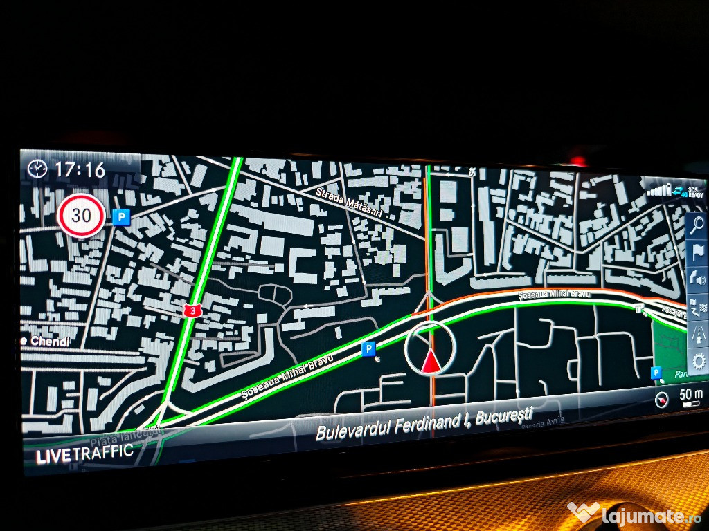 - Navigatie TRAFFIC LIVE Full Europe: masina este conectata la internet prin aplicatia MercedesME si hartile sunt afisate cu trafic live (drumuri blocate / libere / avertizari de blocaje / sugestii rute alternative etc)