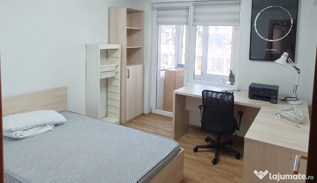 Mobila de dormitor este din lemn masiv, compusă din pat, noptiere, veioze și comodă. Patul are somieră metalică și o saltea confortabilă. Mobilierul și electrocasnicele sunt în stare foarte bună, aproape noi.