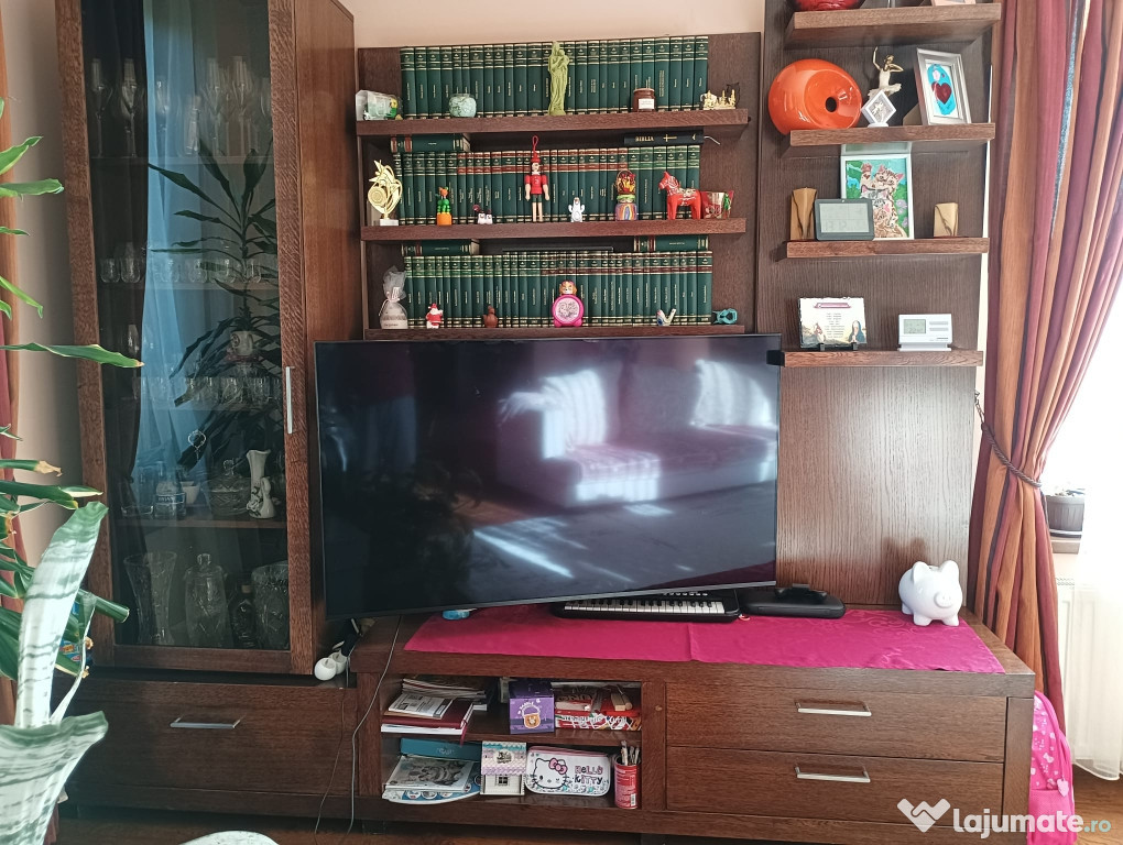 Mobilier de sufragerie folosit, în stare bună. Include rafturi pentru depozitare și decorațiuni, un corp pentru depozitare pahare si o comoda tv.Mobilierul este din pal wenge și are un aspect clasic și elegant, potrivit pentru amenajarea unui living confortabil.