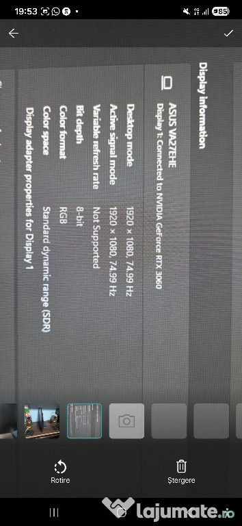 Monitor folosit de 4 ani, nu prezintă imperfecțiuni semnificative, funcționează ca și nou, protecție specială pentru ochi, rată de împrospătare de 75 Hz, HDMI și VGA, rezoluția 1920x1080, FHD, timp de răspuns de 5 ms, aspect imagine 16:9, vine fără ambalajul original, fără cablul alimentator și fără cablu VGA sau HDMI. Este ușor (4.64 kg).Anuntul Monitor ASUS VA27EHE, 27", FHD, 75 Hz, FreeSync, negru este adaugat de pe LaJumate.ro.