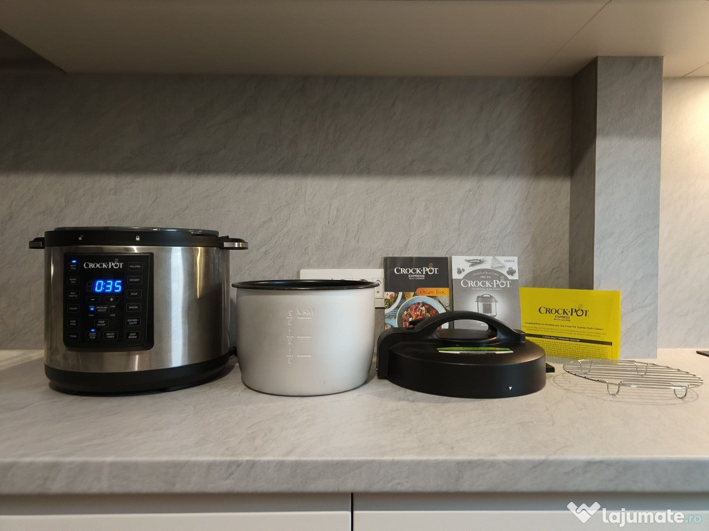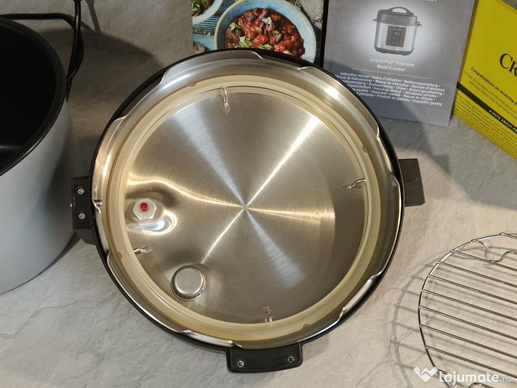 Vand Multicooker Crock-Pot Express CSC051X, 1000 W, capacitate 5.6 litri, control digital, 8 programe presetate si 4 moduri de gatire (gatire sub presiune, abur, prajire, slow cook).Aparatul functioneaza perfect si este in stare foarte buna si complet functional.