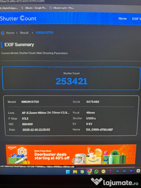 Vand nikon d750 - arata foarte bine, curatat (in service), strap, ocular, doua baterii, incarcator, cutie (original tot, nu replace).+ 24-70 f2.8 N, ca nou (schimbat tot si calibrat in service), capac, parasolar, cutie.