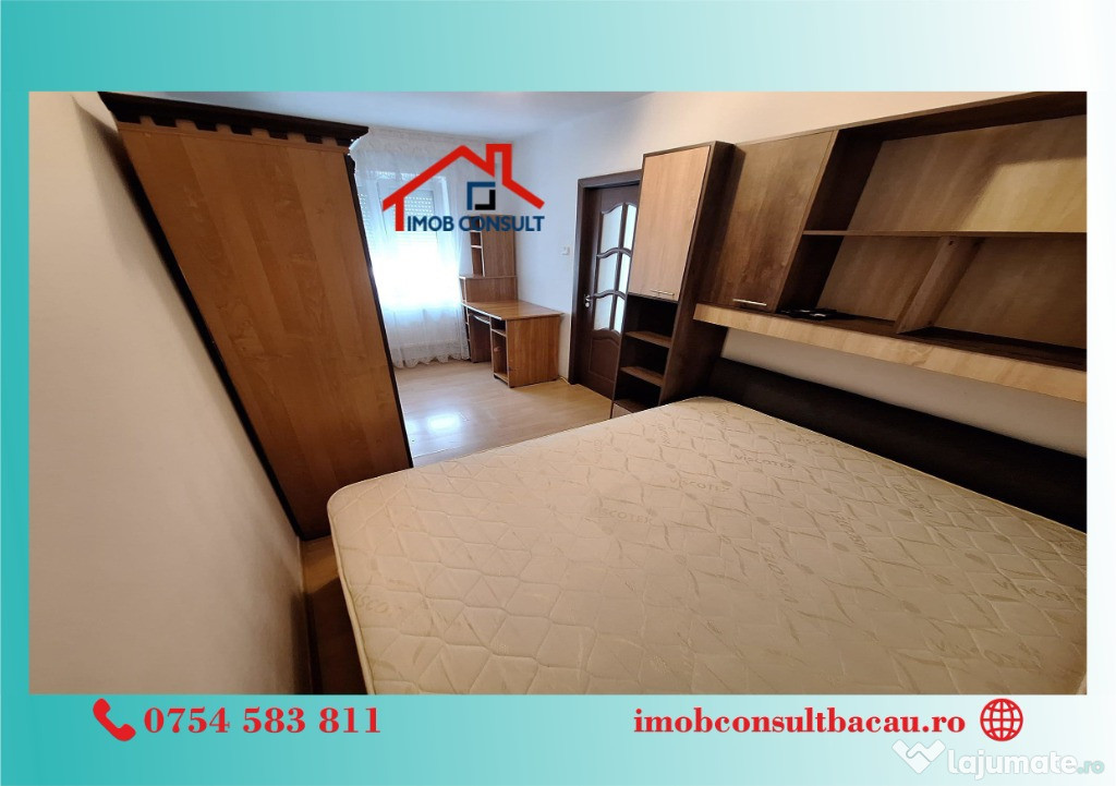 Echipa Imob Consult Bacau vă prezinta spre achizitionare un apartament primitor cu 2 camere semidecomandat, situat la etajul 3 din 4, pe strada Lalelelor, într-o zonă liniștită, accesibilă și bine cotată din municipiul Bacău.Locuința ofera un ambient confortabil și bine proporționat, perfect atât pentru o persoană sau un cuplu aflat la început de drum, cât și pentru investiție.