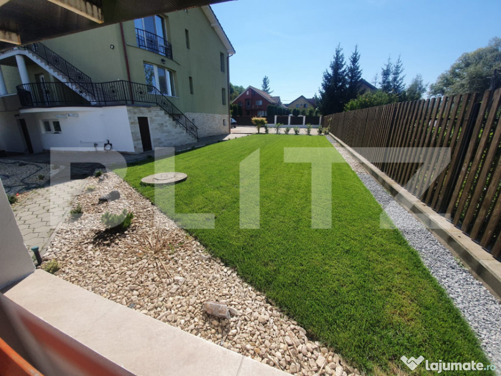 Curte amenajată cu spațiu verde, piatră decorativă și vegetație