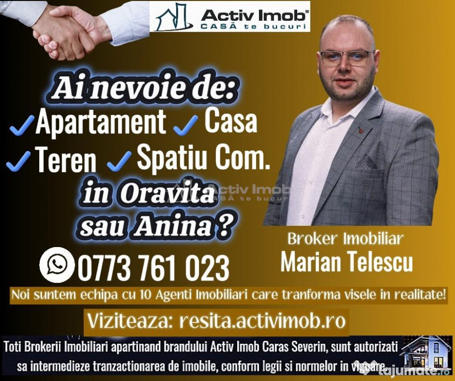 RECOMANDARE: PENTRU A VIZUALIZA TOATE OFERTELE SI A PRIMI NOTIFICARI CU NOILE OFERTE, VA RUGAM SA SOLICITATI CERERE DE PRIETENIE PE FACEBOOK: Imobiliare Marian Telescu Oravita-Anina SAU TIKTOK: Telescu Imobiliare .