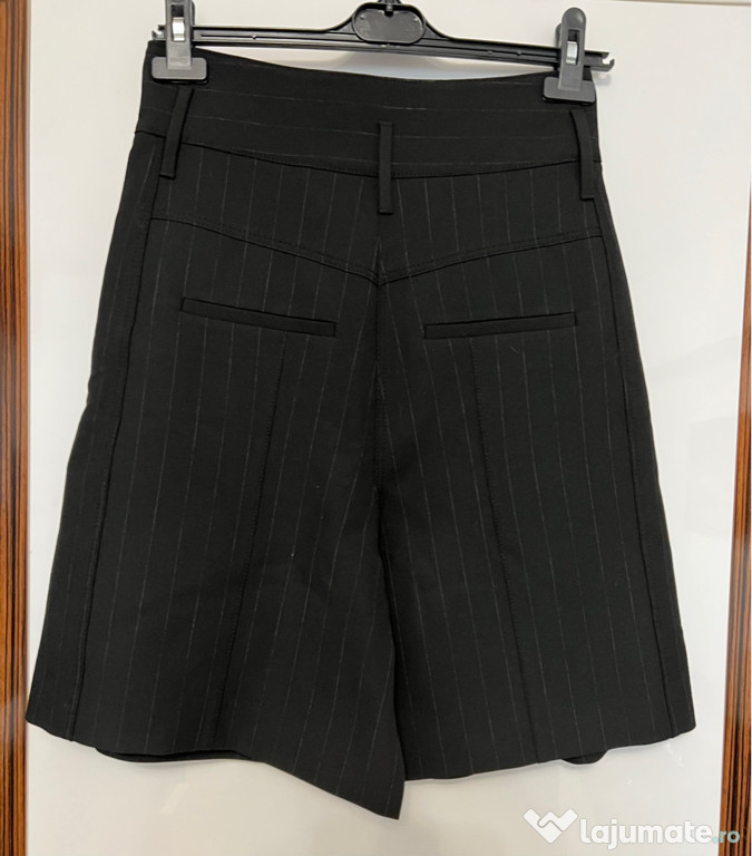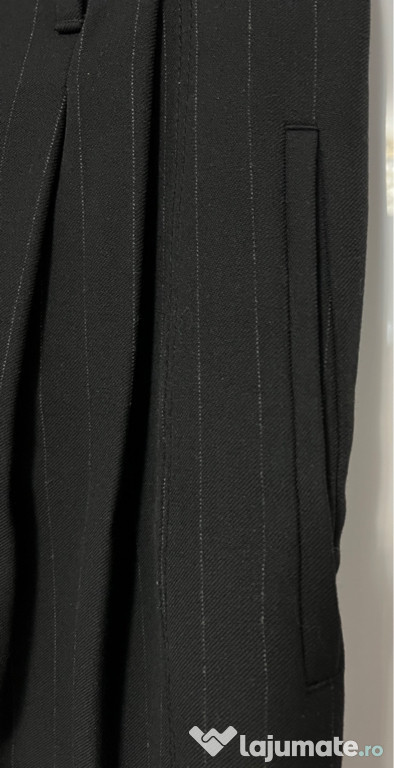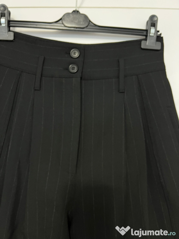 Pantaloni Zara, mărimea S, noi fără etichetă, culoare neagră cu dungi subțiri gri. Model modern, larg, cu 2 pense mari în față , buzunare oblice în față și buzunare drepte în spate , betelie lată , cu găici mari, în spate croiți in V. Se închid cu fermoar în față și 2 nasturi, au și nasture de rezervă . Lungimea 55 cm.Anuntul Pantaloni cu pense, până la genunchi, Zara,S este adaugat de pe LaJumate.ro.
