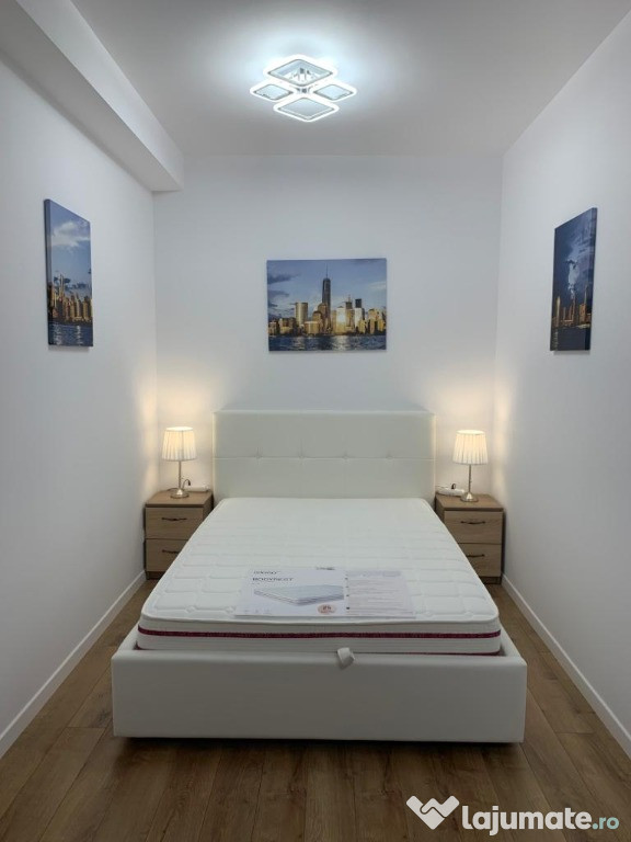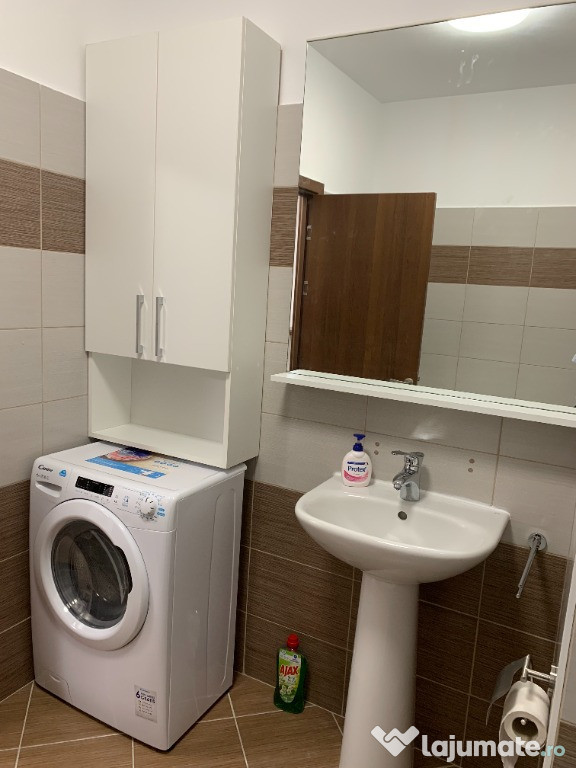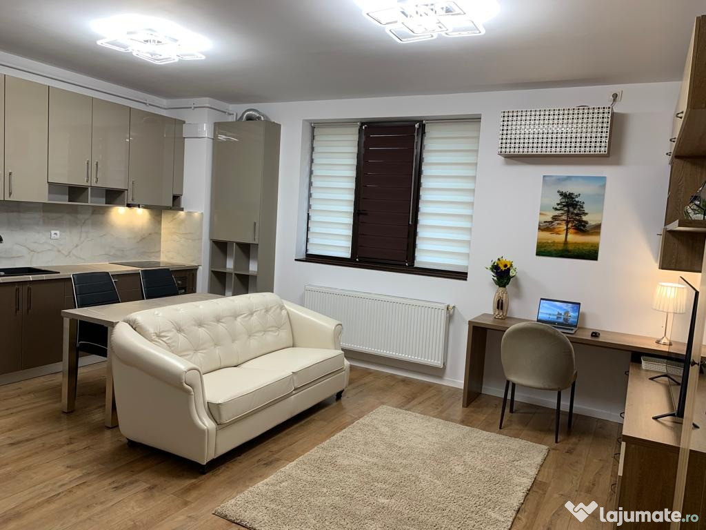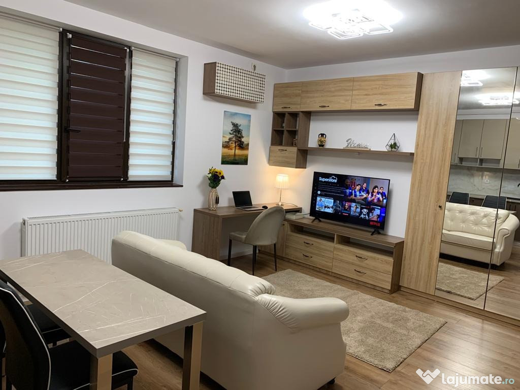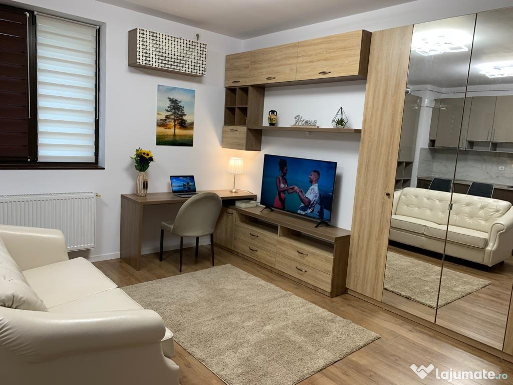 Garsoniera moderna (tip Studio, cu spatiu separat pt. dormit), 37mp, mobilata si utilata complet.Dotari: centrala proprie, aer conditionat, masina de spalat, baie cu cada, combina frigorifica, hota, cuptor si plita electrice, mobilier pe comanda, canapea 3 locuri, pat dublu cu somiera rabatabila, TV Smart LG 4K Nanocell, internet WiFi, fier + masa de calcat, uscator de par, aspirator, iluminat led etc.