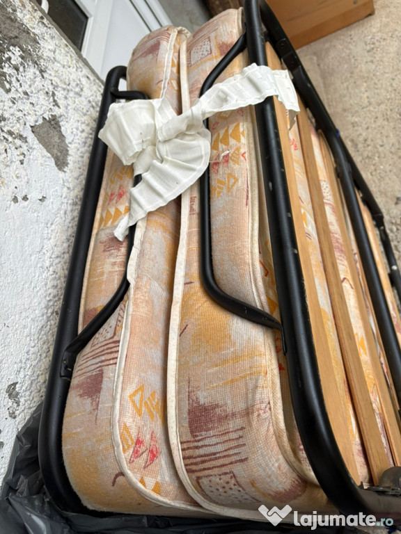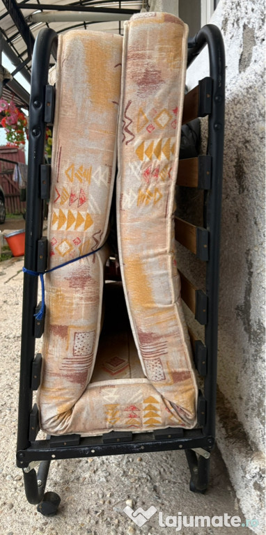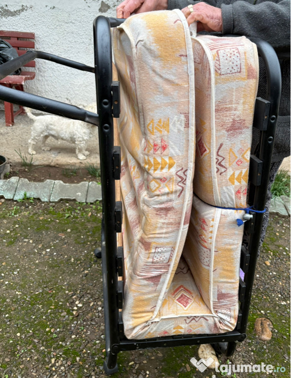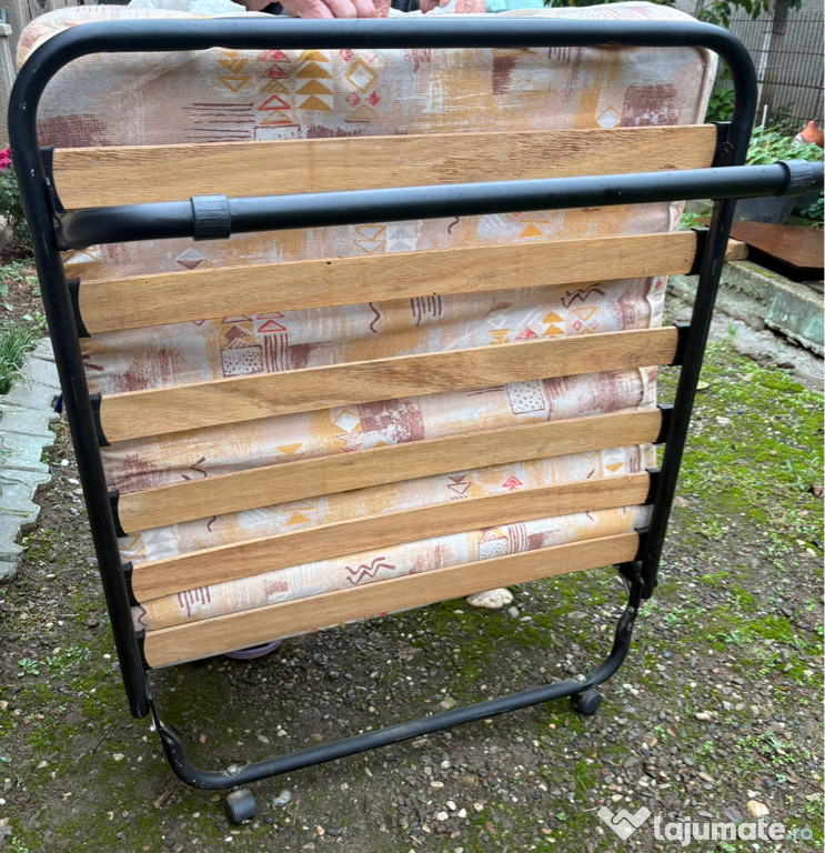 Pat pliabil cu roți pentru o persoană, în stare de bună cu mici urme de folosință ideal pentru oaspeți și încăperi mici ! Format din cadru metalic robust cu lamele de lemn solid , saltea tapițată cu material textil bej - maro cu un design elegant!Dimensiuni : (1,85x 0,80 m)