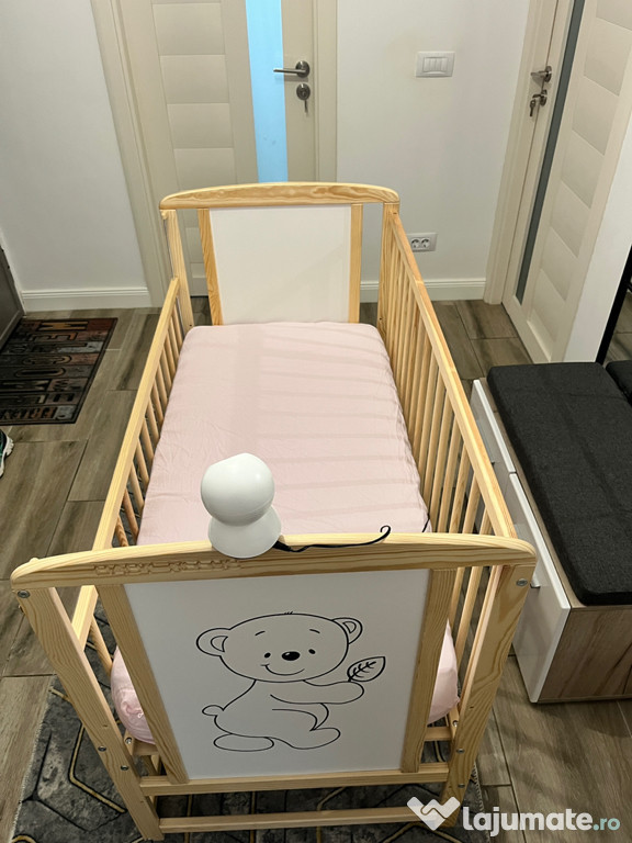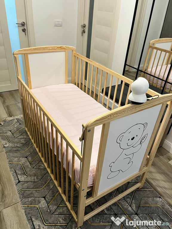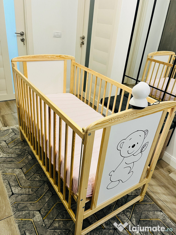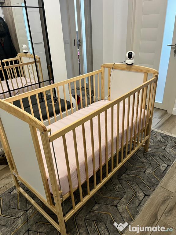Patut din lemn Timmi Babyneeds 120x60 cu laterala culisanta+ saltea cu husa detasabila din microfibra!Folosit doar 3 luni!