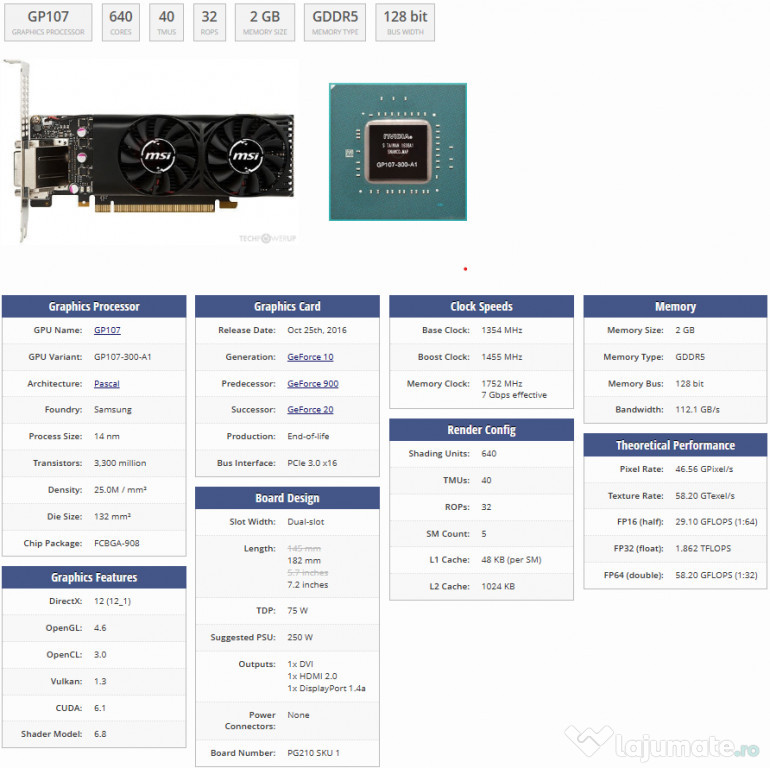 Placa Video MSI Nvidia GeForce GTX 1050, 2GB GDDR5, bus 126 bit,