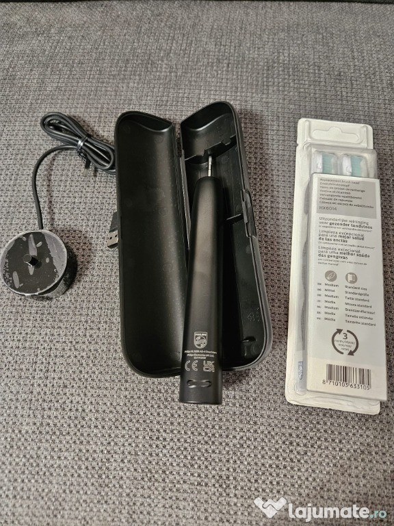Periuta se vinde impreuna cu o cutie de transport, incarcatorul tip stand si un set de 4 capete sigilate.