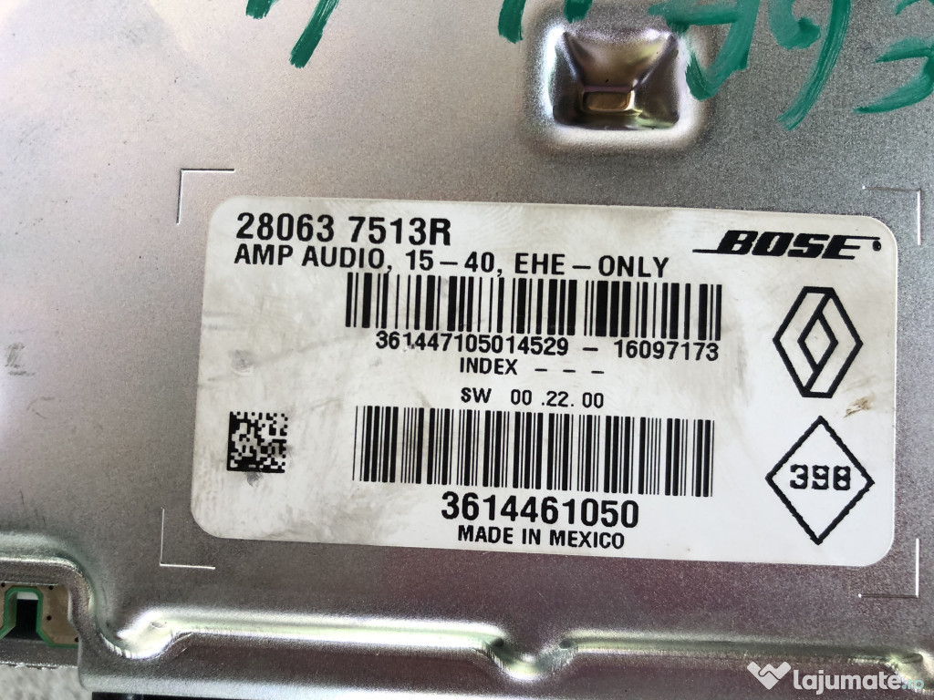 Amplificator audio Renault Megane 4. Cod(uri): 280637513R, BOSE. Piesele comercializate sunt originale, provenite din dezmembrari. Dispunem de o gama larga de piese multimarca. Piesele sunt verificate inainte de a fi puse spre vanzare. In caz de neconformitate piesa se poate returna. Va rugam sa verificati disponibilitatea pieselor telefonic. Trimitem in tara prin curier.Marcă: Renault