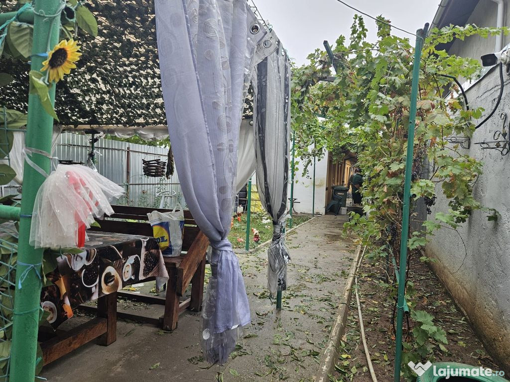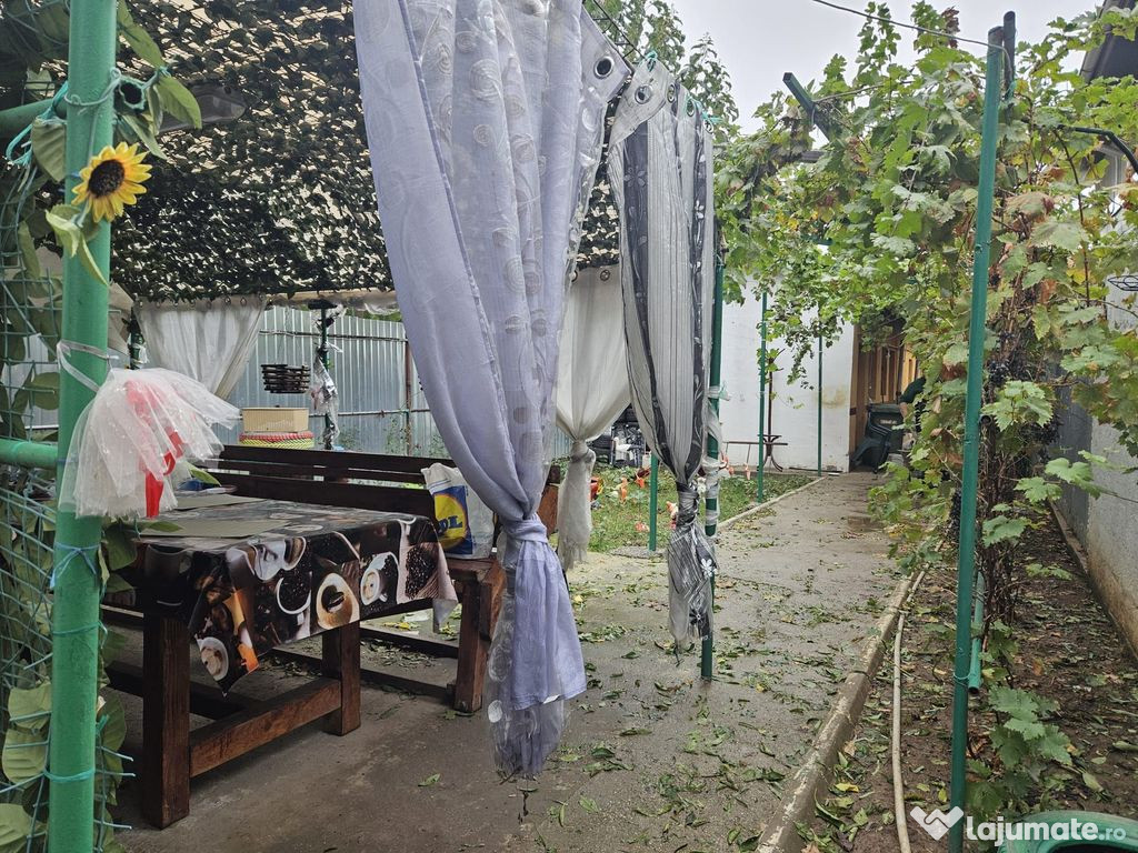 Terasă și curte proprie. Imobilul este racordat la gaze, canalizare și apă curentă, având acoperiș din tablă.