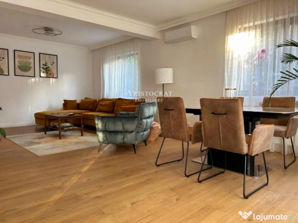 - La parter un hol luminos , baia de serviciu , dormitor ce poate fi folosit și ca birou, bucataria complet utilata si un generos living si dining open space cu iesire in terasa exterioara