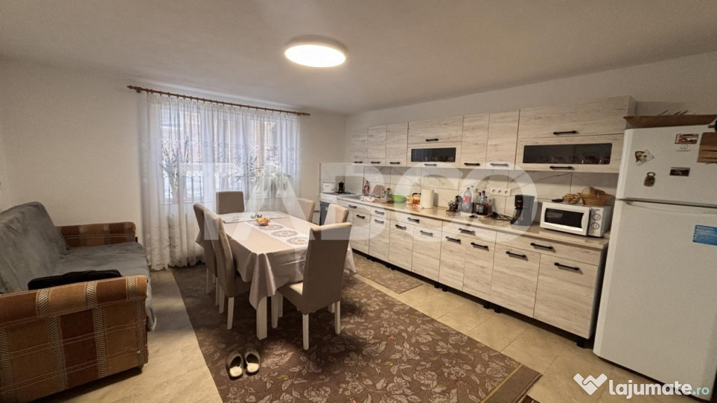 Casa este mobilata complet si utilata: aragaz, masina de spalat rufe, frigider cu congelator. Casa are o curte libera 426 mp suficient loc pentru zona de joaca a copiilor si spatiu de depozitare. Finisajele interioare sunt clasice: