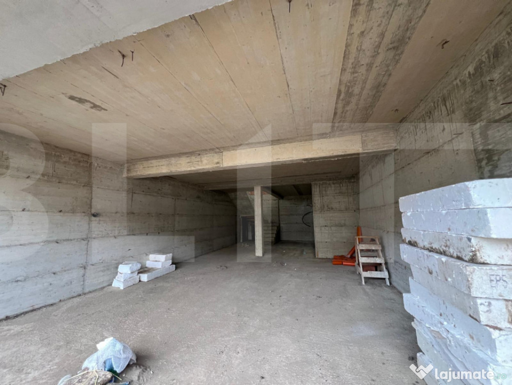 Are o curte generoasa in spate iar la demisol exista un garaj cu spatiu de depozitare.