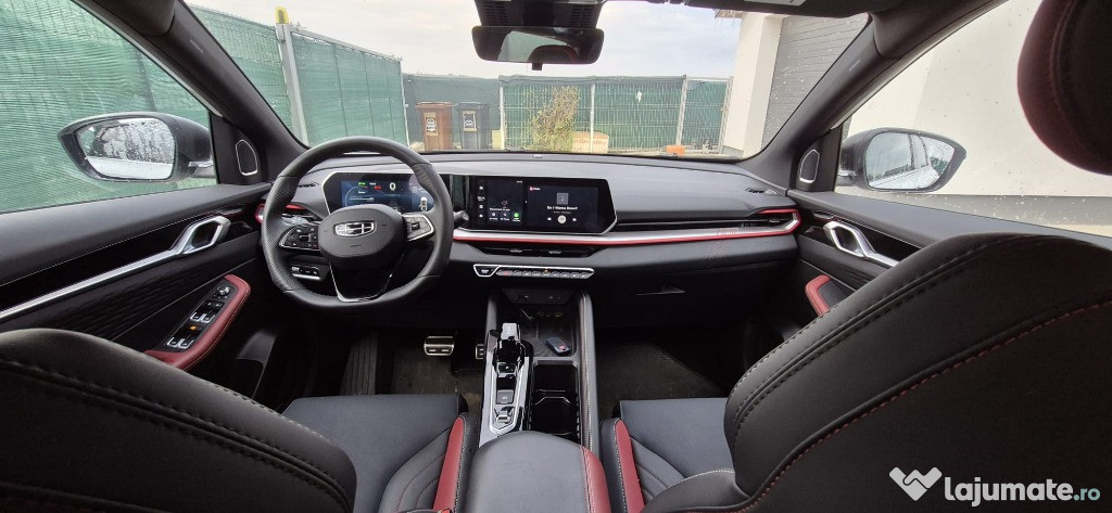 Ce pot sa mai spun decat ca Geely sunt cei ce fabrica Volvo. Atentia la detalii, designul si tehnologia integrata sunt uimitoare. Masina are dotari full. Are plafon panoramic, trapa mare, portbagaj electric, pornire masina din cheie (avantaj atat iarna, cand poti urca in masina incalzita, cat si vara, cand racoreste masina inainte de a urca in ea), parcare automata (face parcarea integral - schimba vitezele automat (D,R), ba mai mult, iti permite sa selectezi locul de parcare propus si sa-l asezi unde vrei tu, iar masina va parca acolo.), inchidere automata geamuri si trapa daca ploua, geamurile si trapa se inchid automat la inchiderea masinii (nu puteti uita geamul deschis). Scaune din piele. Tableta porneste din stanga volanului si merge pana la mijlocul bordului. 4 tevi de esapament reale. Lumini ambientale personalizabille (are si optiunea de a functiona in ritmul muzicii). La apasarea acceleratiei, efectiv te infinge in scaun, chiar daca nu este in modul sport. Are toate functiile unei masini din 2025. Masina are folie aplicata pe geamuri.Anuntul Primul proprietar - masina noua este adaugat de pe LaJumate.ro.