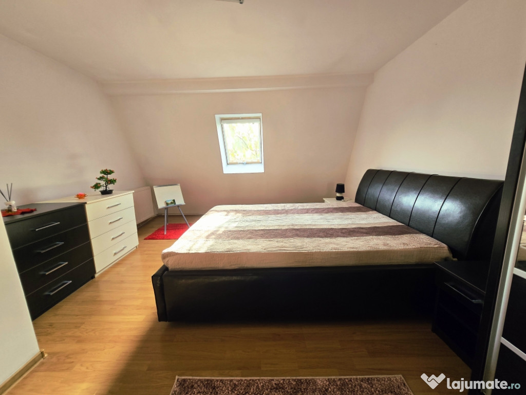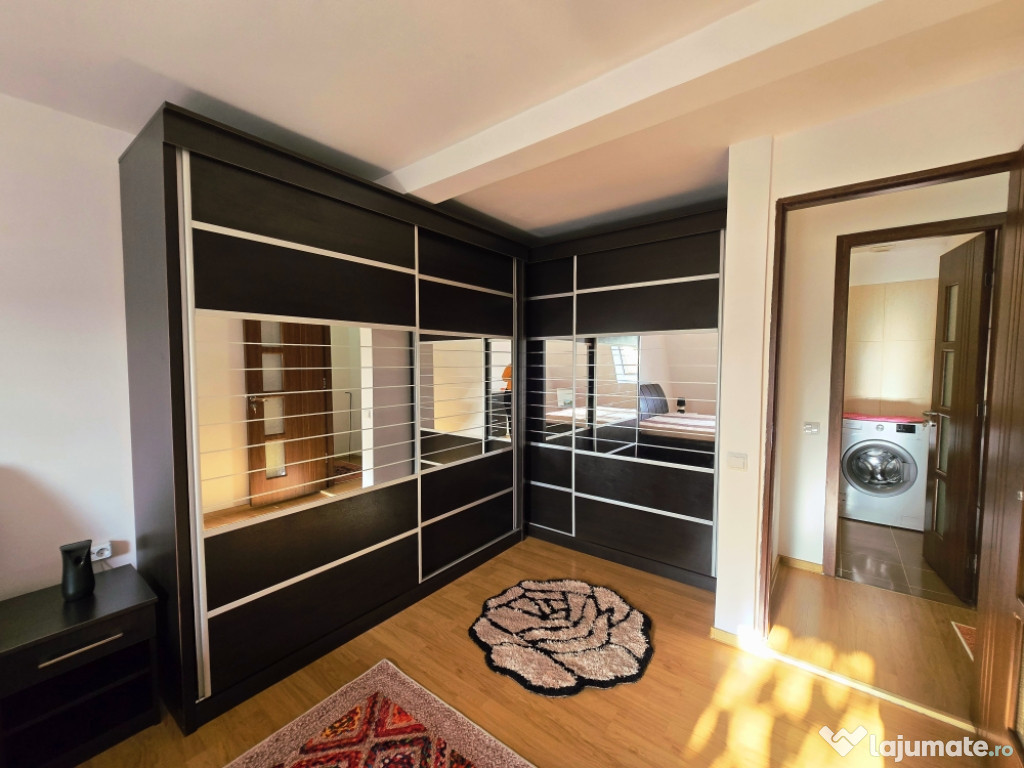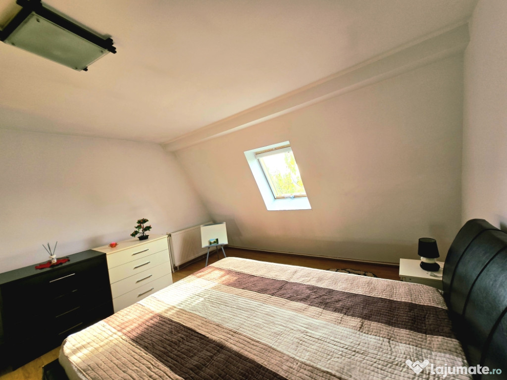 FACILITATI: Mobilat si utilat complet: Centrala termica proprie, aer conditionat, bucatarie mobilata si utilata complet [plita, cuptor electric, hota, cuptor cu microunde, frigider), masina de spalat, tamplarie PVC cu geam termopan [incl. plasa insecte] si jaluzele noi, fereastra Velux, usa metalica la intrare recent schimbata, canapea coltar in living, mobila facuta la comanda pentru zonele de dining, living si dormitor, dressing generos, adaptat nevoilor tale de zi cu zi.