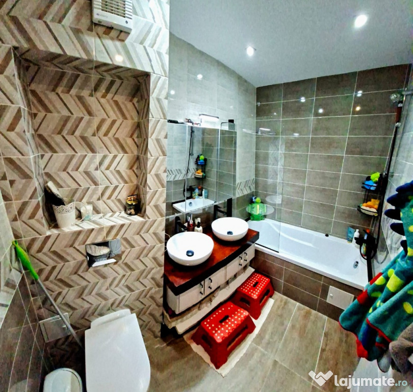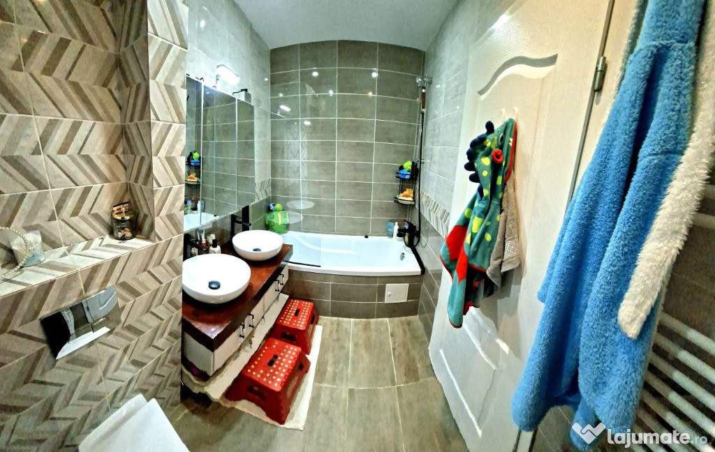 •Baia are toaletă incastrata + raft, 2 chiuvete funcționale, cadă și calorifer tip uscător.