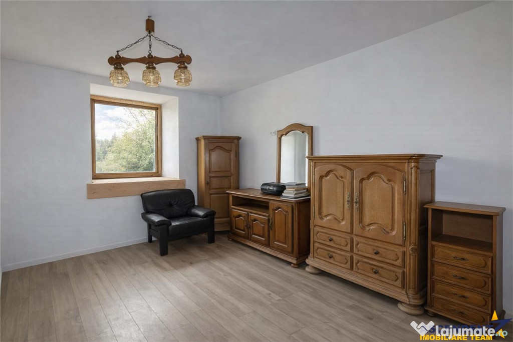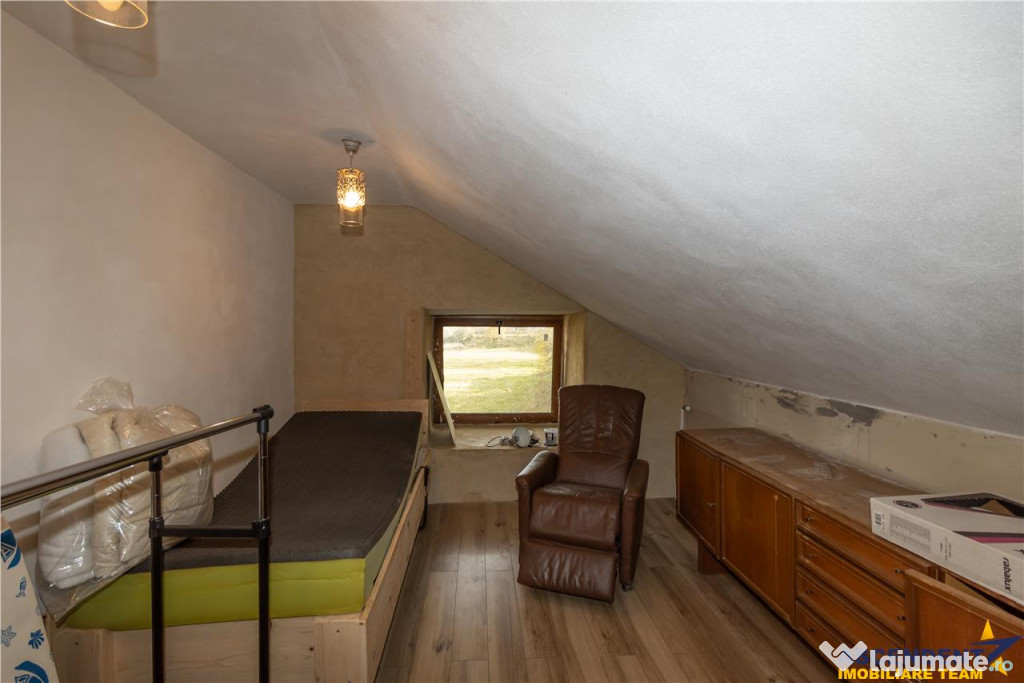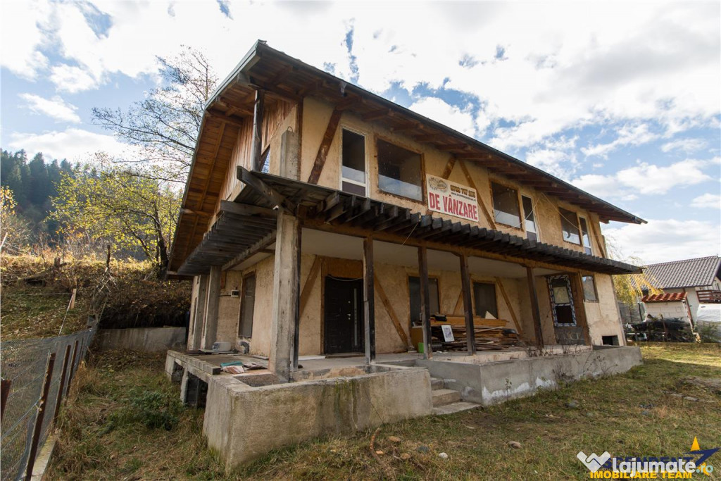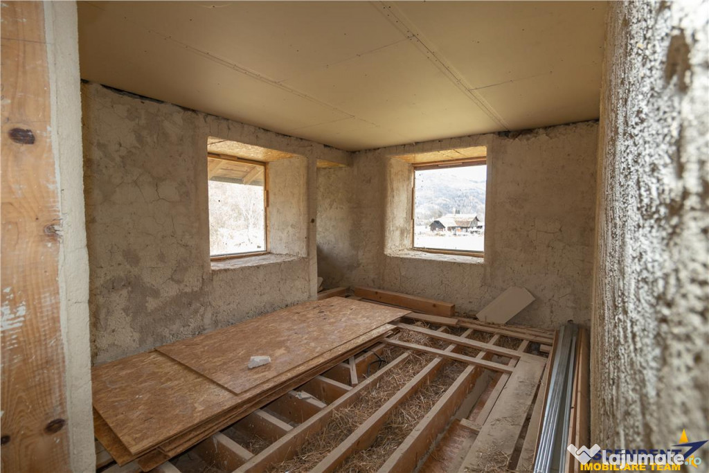 Imobilul are o compartimentare personalizata si este neintabulat. La parter se afla un living primitor, o camera, o baie, o bucatarie, un hol si o debara, aflate in stadiu partial finalizat. Etajul ofera doua camere mai mici, dintre care una aproape finalizata cu baie proprie, precum si patru camere suplimentare prevazute cu bai si balcoane ndash; ideale pentru transformarea casei intr-o pensiune de tip boutique sau intr-un refugiu montan pentru familie si prieteni.