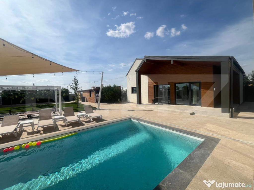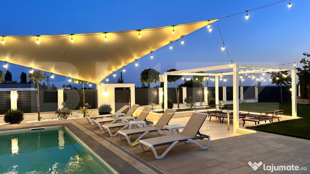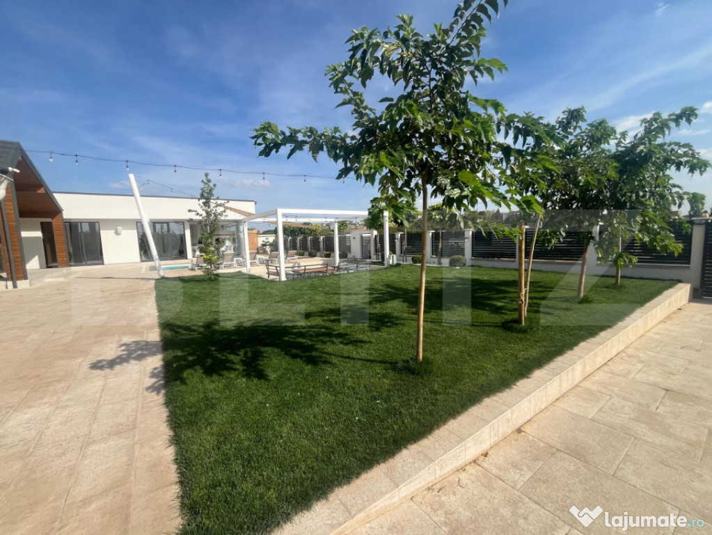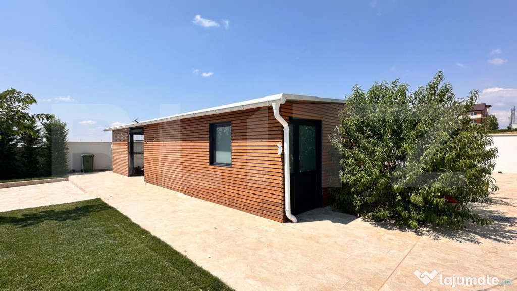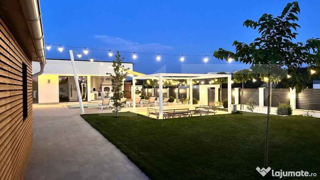 Pe teren mai regasim o anexa de 60 mp, al carei acoperis este pregatit pentru un proiect de panori fotovoltaice. Piesa de rezistenta este curtea extrem de frumos amenajata cu o pisiciana de 8/4 zona de relaxare, sezlonguri, gazon, elemente decorative, gard de beton cu fundatie si elemente de aluminiu. Proprietatea este racordata la curent trifazic, gaz, canalizare, apa dar totodata beneficiaza si de pompa de caldura chiar si pentru piscina, doua puturi, aspresoare, un sistem de ingrijire smart al gazonului plus alte sisteme smart pentru lumini si nu numai. Pentru si mai multe detalii nu ezitati sa ne contactati!