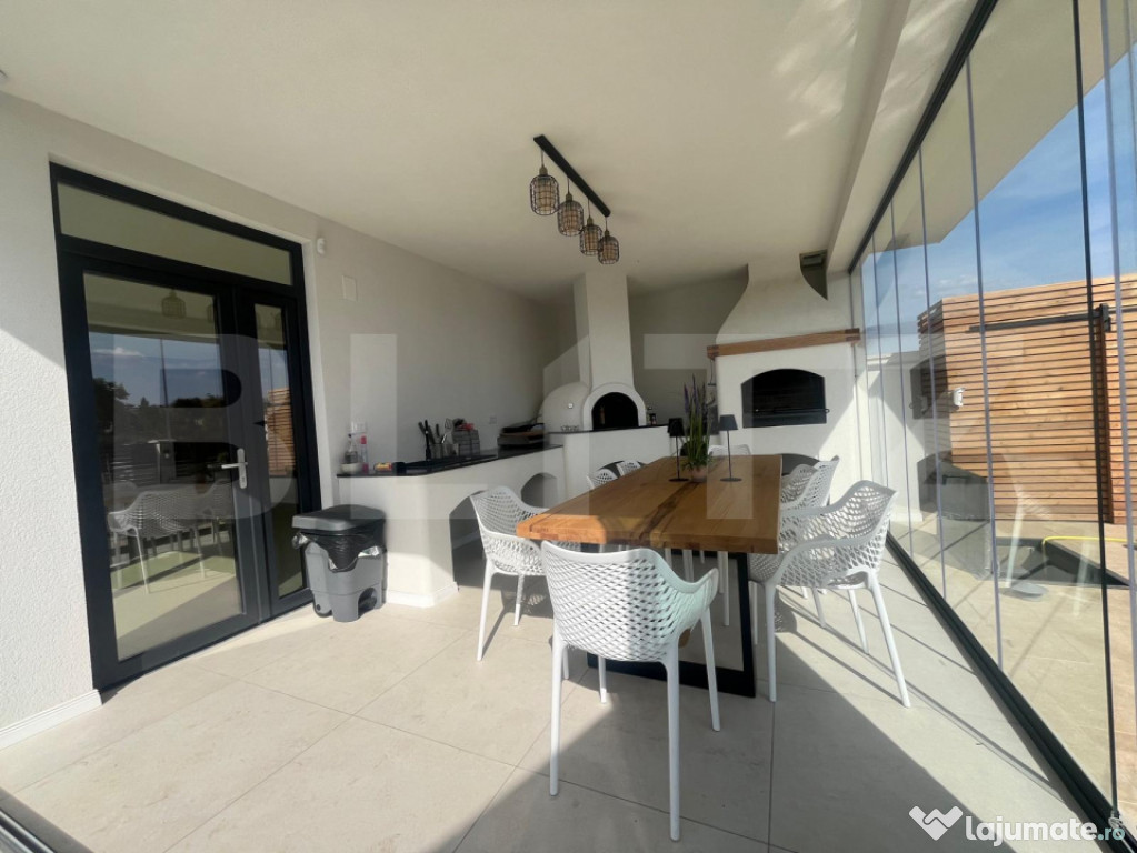 In continuarea constructiei la sol regasim si o bucatarie de vara, semideschisa, amenajata cu toate cele necesare plus cuptor de pizza si zona de gratar.