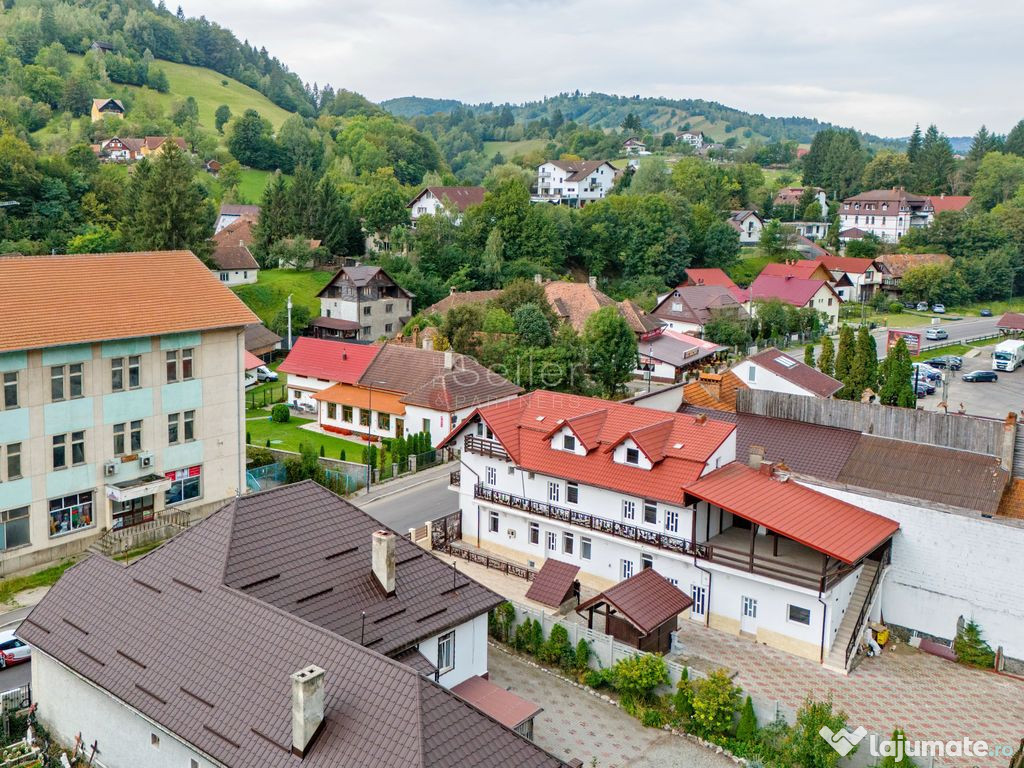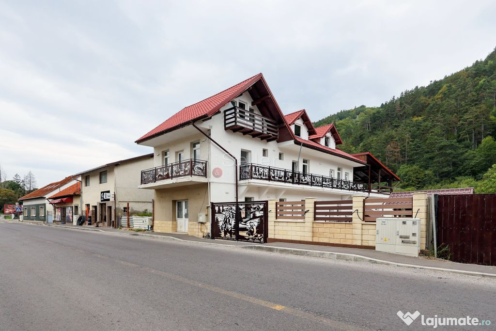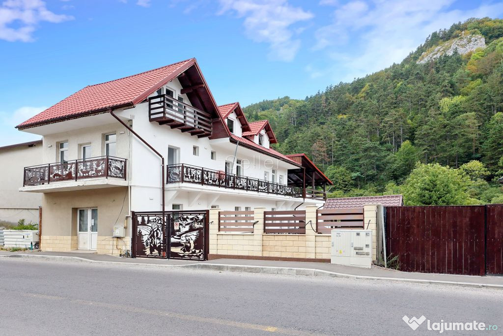 Proprietatea este amenajata in scop turistic, este amplasata pe o suprafata de 1006 mp de teren si este compusa din 8 camere fiecare cu baie proprie, avand o capacitate de cazare de 20 de persoane.