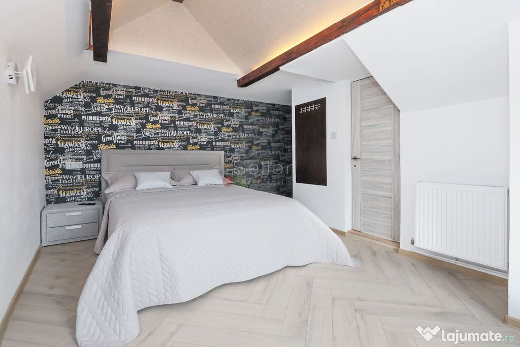 - Parterul detine: un living generos, bucatarie, wc, o camera de cazare cu baie proprie;