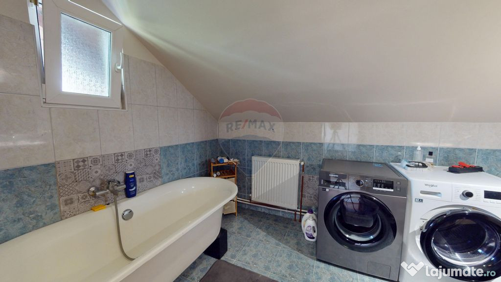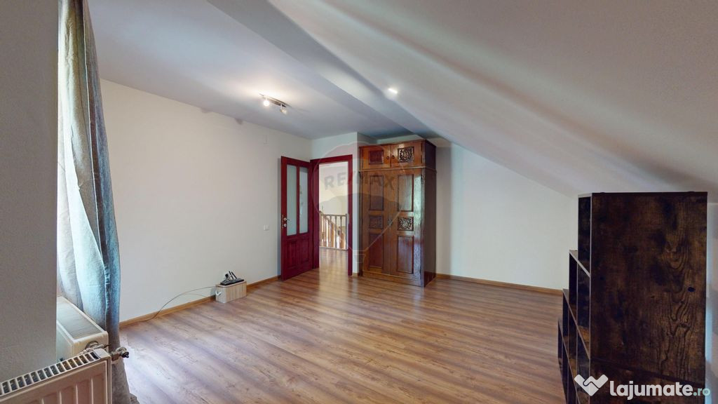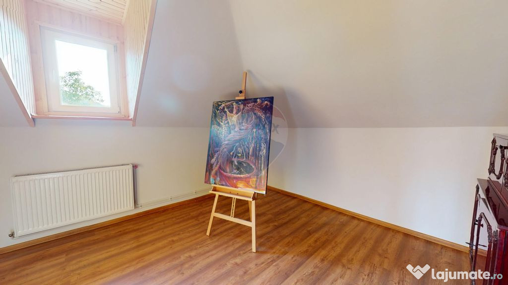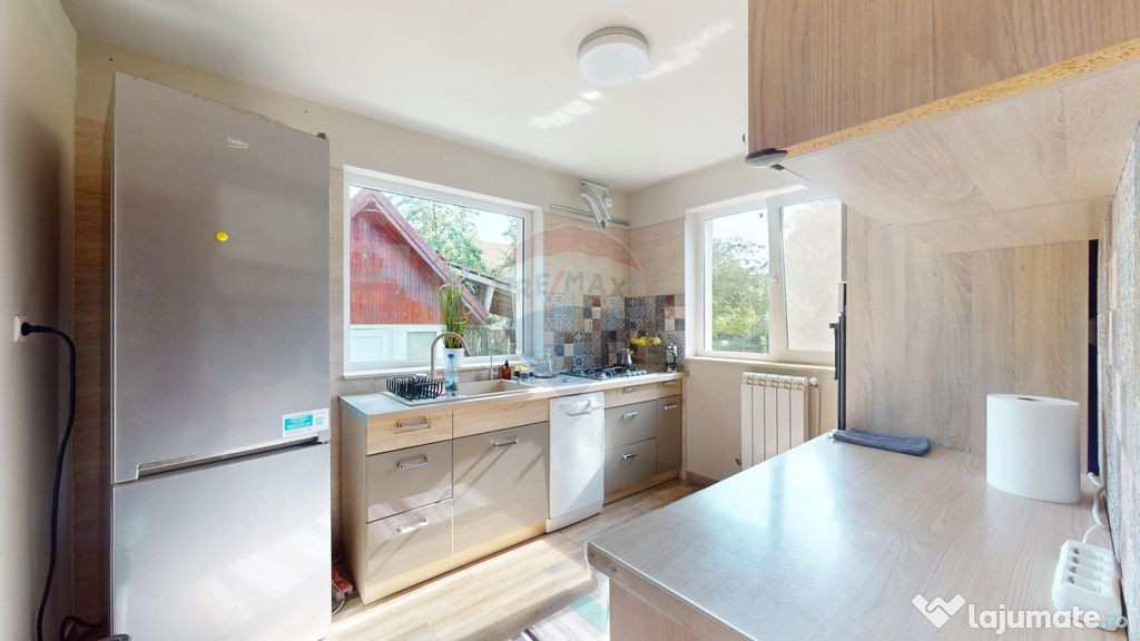 La parter se află un living generos, bucătăria, un dormitor, o baie și un hol. Etajul include două dormitoare, o baie, un hol și o cameră suplimentară care poate fi folosită ca birou, dressing sau spațiu de recreere. În completare, există o cameră tehnică cu centrală pe lemne de tip gazeificare și 12 calorifere, dar și posibilitatea de racordare la gaz, aflat în imediata apropiere. Proprietatea dispune de beci cu acces direct din casă și de o anexă exterioară, utilă pentru depozitare sau pentru amenajarea unei bucătării de vară.