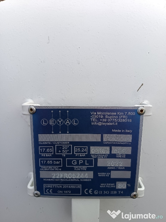 Vând rezervor GPL suprateran, capacitate 1750 litri, fabricat în 2022. A fost utilizat puțin timp, se află în stare excelentă, fără defecte sau rugină.Capacitate: 1750 litri.