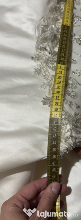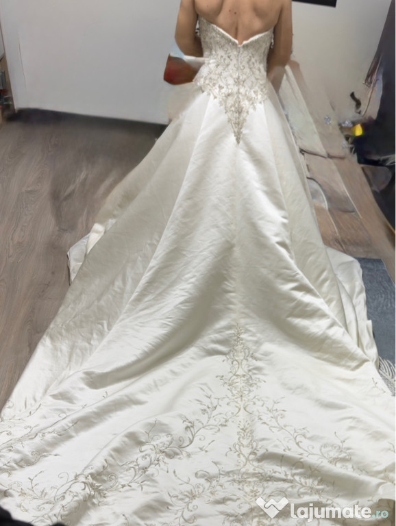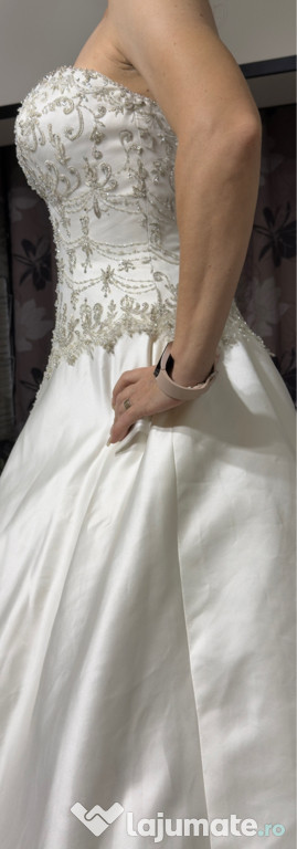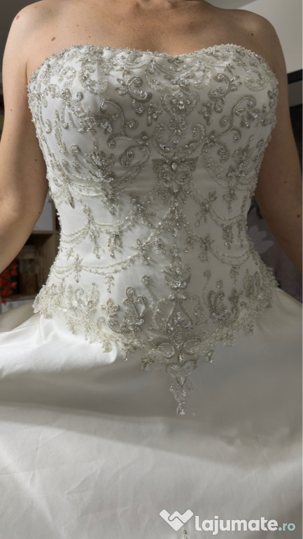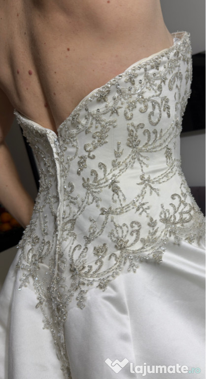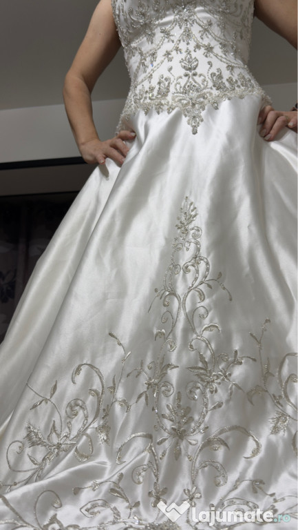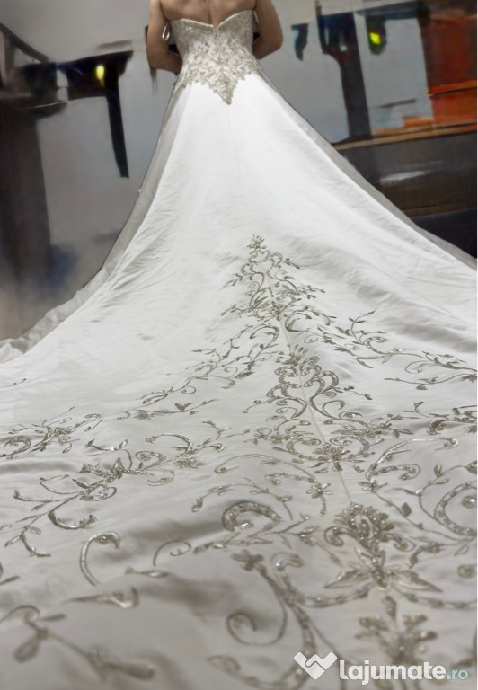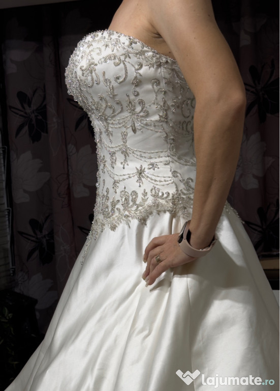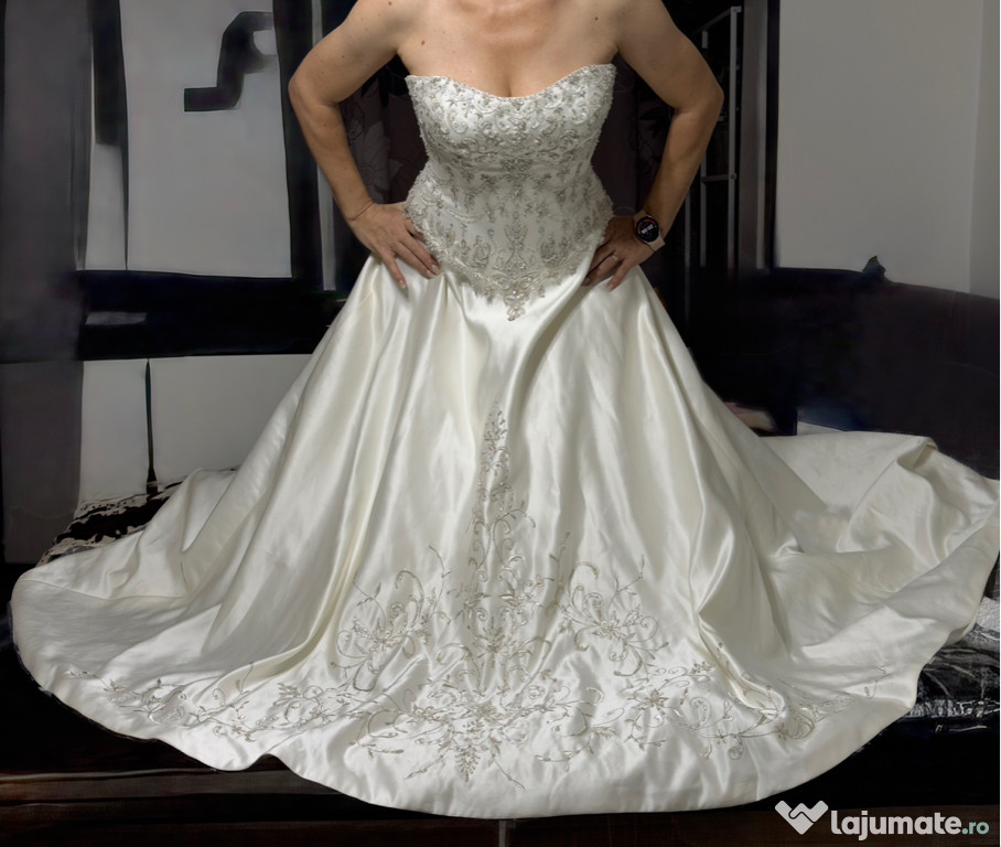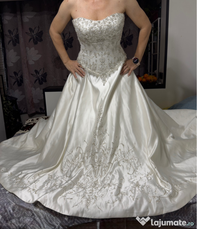 Rochie de mireasă Signature, model elegant și foarte bine lucrat. Rochia are material satinat, broderie bogată cu mărgeluțe și aplicații fine pe bust și pe partea frontală a fustei. Broderia iese în evidență și pe trenă. Trena are aproximativ 1,5 metri, îți oferă un efect spectaculos când mergi.Rochia are închidere la spate cu moș și babă, plus fermoar. Bustul măsoară 41 cm, talia 46 cm. Mărimea trecută pe etichetă este 12, corespunde de obicei unui M spre L. Îți recomand să verifici măsurile tale pentru siguranță.