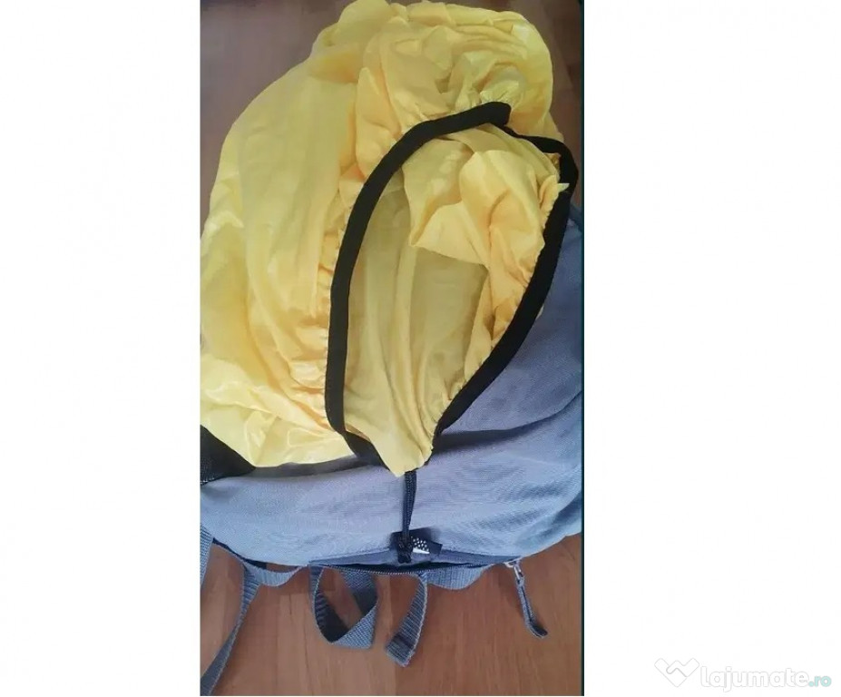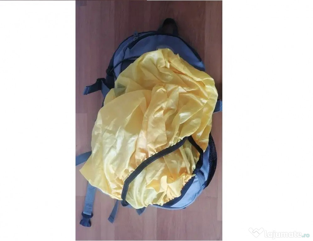 Rucsac pentru ciclism/drumetii.Culoare gri-petrol cu elemente reflectorizante si husa antiploaie (galbena) ascunsa/atasata intr-un buzunar separat pe fundul rucsacului.