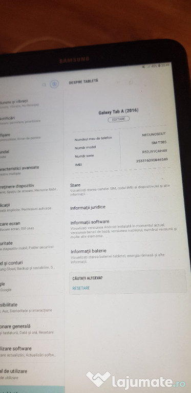 Tableta samsung galaxy tab A 2016 model sm t585 cu sim ,2g ,memorie interna 16g si slot micro sd .Anuntul Samsung galaxy tab A 2016 ,Sm-t585 este adaugat de pe LaJumate.ro.