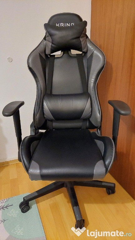 Scaun pentru gaming, model Kring Lars, stare foarte bună, reglabil pe înălțime și înclinare, cotiere sunt și ele reglabile pe înălțime, cu pernă în zona lombară si la nivelul capului (ambele perne ajustabile pe inaltime).bine îngrijit, nu scârțâie.