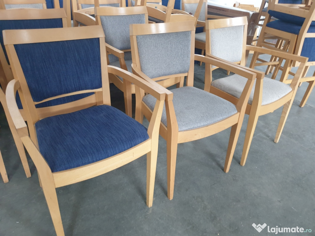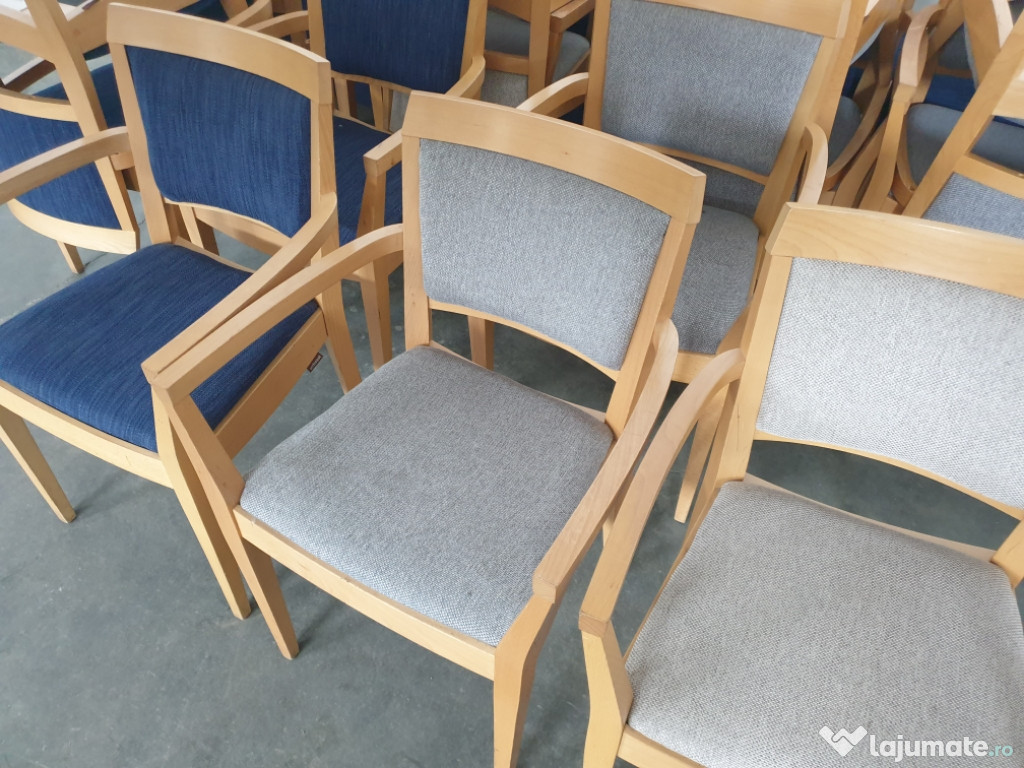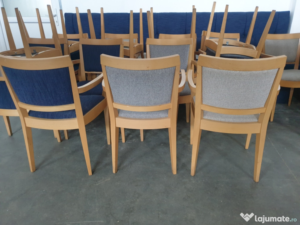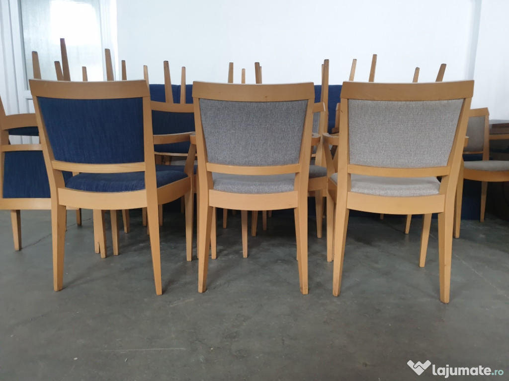 Scaune din lemn de stejar, cu tapițerie în nuanțe de gri și albastru. Mobilier robust și durabil, potrivit pentru bucătărie, living sau alte spații. Produse second-hand, dar în stare bună de utilizare.16 bucati din care 6 albastre 4 gri deschis și 6 gri inchis