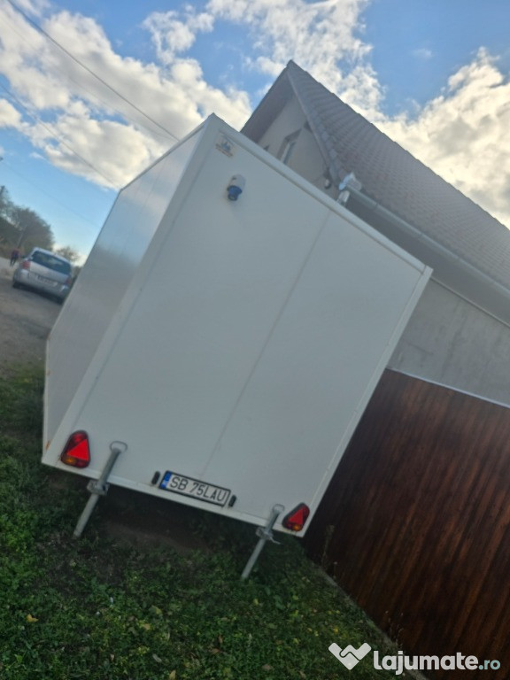 Remorca acoperita cu prelata. Ideala pt tractare auto. Dotata cu rampe si troliu. Masa max 2800 kg. L ...