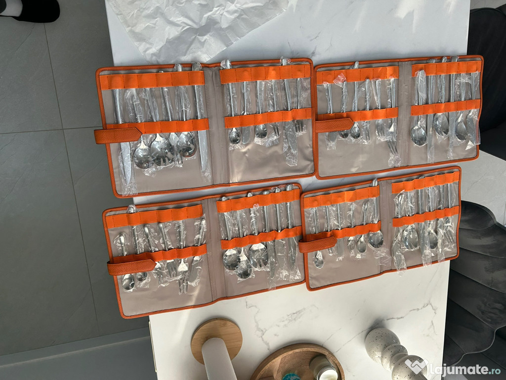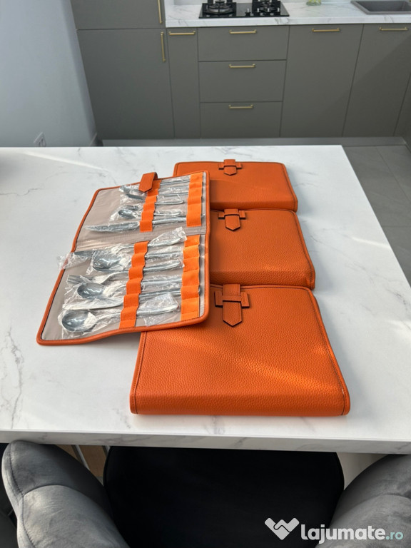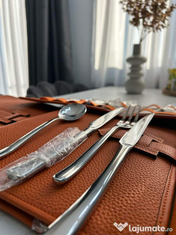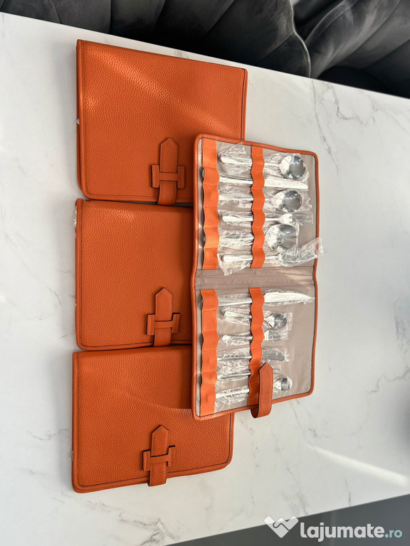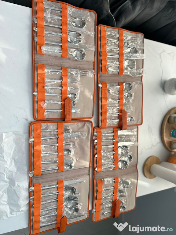 Set Tacamuri Hermes-Paris, produs nou.Setul contine 72 de piese, 12 piese / husa din piele naturala. Fiecare tacam este ambalat individual, au fost defacute pentru poze si ambalate.