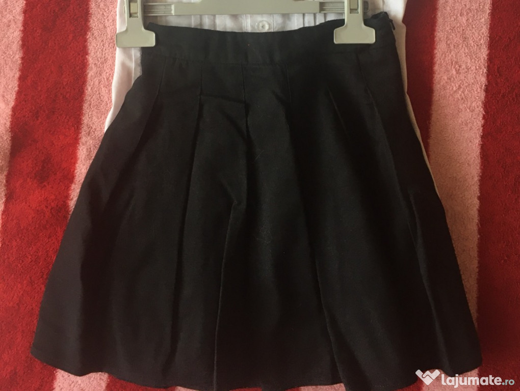 Vand un set de scoala format din camasa cu maneca scurta si fusta neagra in cute. Pentru fete de 8 ani, marimea 128. Camasa are, in partea dreapta, litera W de mana din strasuri (marca Wanex).Fusta este de la Danina line, in fata are pliuri, iar in spate este creata. In spate putand fi stransa din elastic, in functie de mijlocelul fetitei.