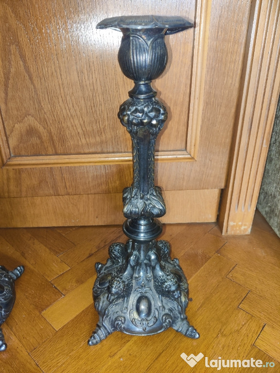 Se vinde o pereche de sfeștnice decorative, metal alama din ce am putut sa îmi dau seama. Detaliile sunt foarte bine realizate după cum se poate observa in poze.Necesita o curățare generală. Se vând doar ca și set. Pentru întrebări va stau la dispoziție.