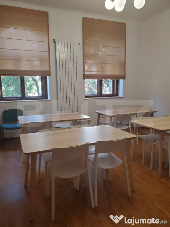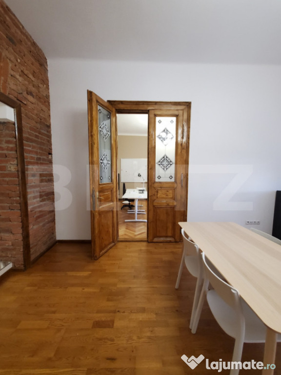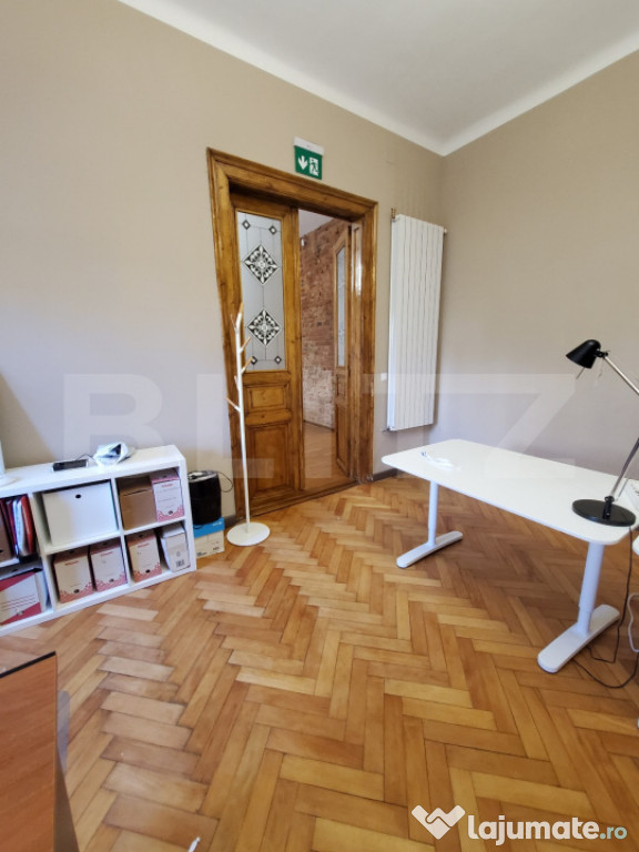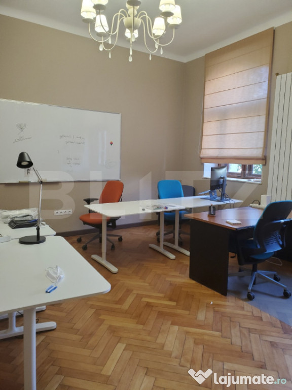 Blitz vă propune spre închiriere un elegant spațiu de birouri situat în Palatul Széki, una dintre cele mai emblematice clădiri istorice din centrul municipiului Cluj-Napoca. Imobilul impresionează prin arhitectura sa deosebită, care îmbină farmecul epocii cu funcționalitatea contemporană, oferind un cadru reprezentativ pentru desfășurarea activităților profesionale.Spațiul are o suprafață utilă de 66 mp, fiind compartimentat și finisat astfel încât să asigure confortul și eficiența necesare oricărui tip de activitate — birouri, agenții de consultanță, cabinete profesionale sau alte servicii similare.